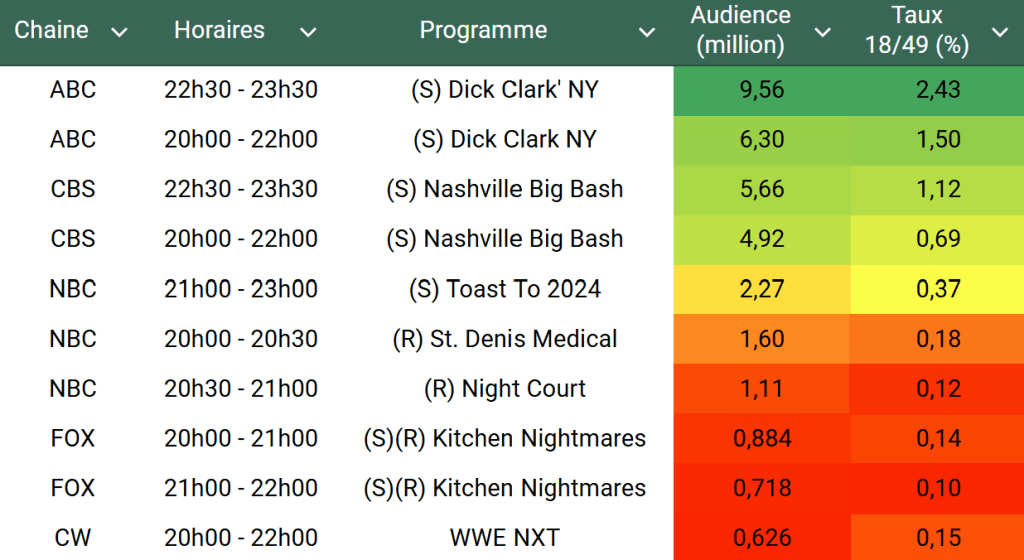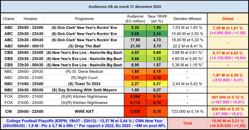 Audiences US du Mardi 31.12.24 : La soirée du 31 est toujours un carton sur ABC qui culmine à plus de 21 millions à 00h. Très bon score aussi pour CBS. NBC et FOX faibles. ESPN au top.