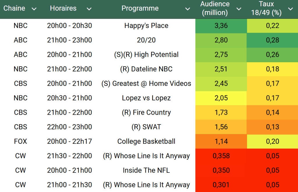 Audiences US du Vendredi 03.01.25 : ABC domine sur l’ensemble de la soirée grâce à High Potential et 20/20 qui est au plus haut depuis Mars 2024. Happy’s Place signe la meilleure audience de ce vendredi soir.