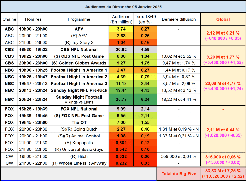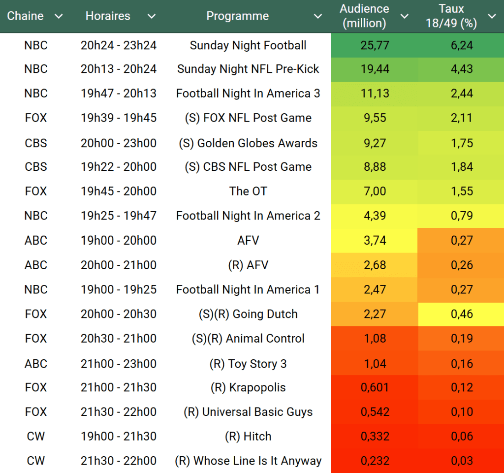 Audiences US du Dimanche 05.01.24 : Gros carton pour Sunday Night Football qui signe un record. Les Golden Globes au top sur CBS. Going Dutch plus fort en rediff qu’en inédit grâce à la NFL sur FOX.