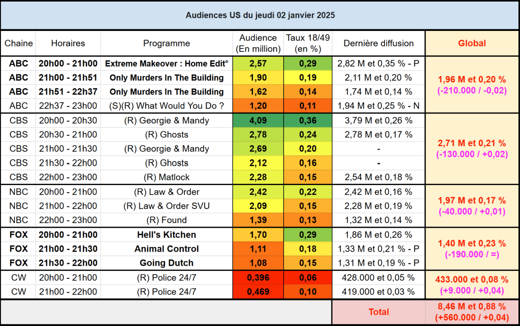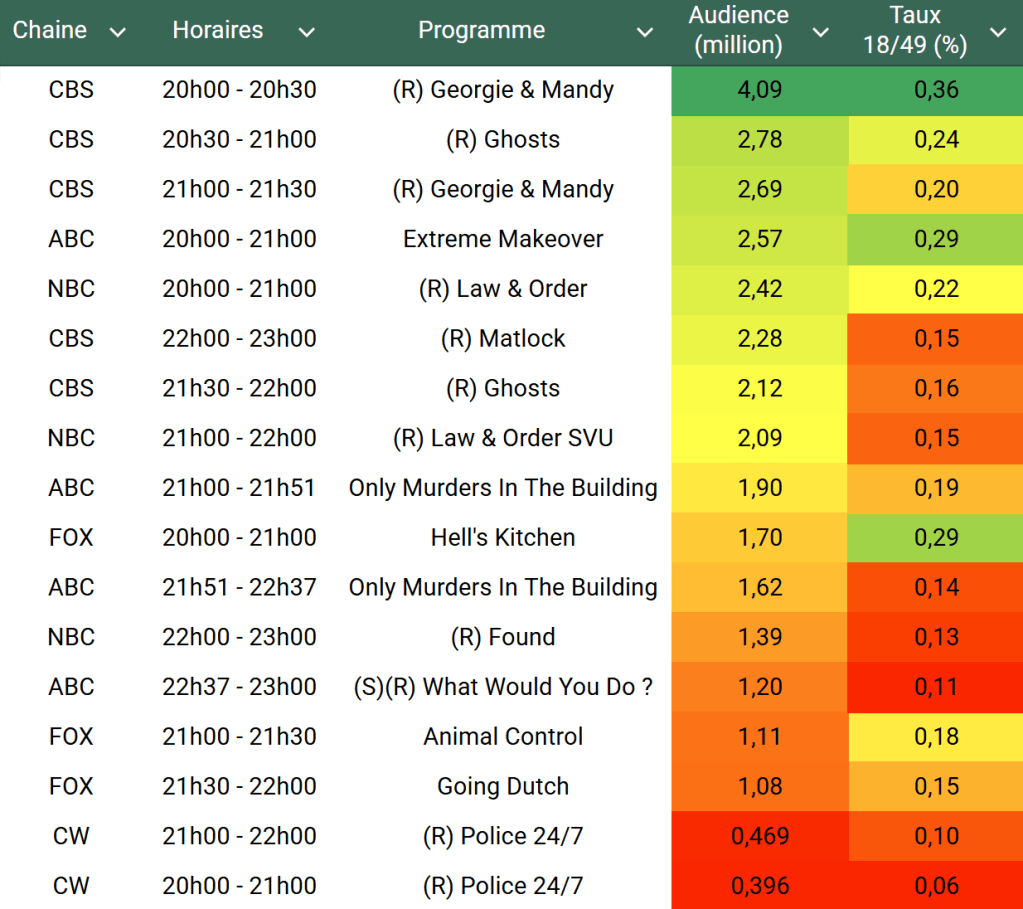 Audiences US du Jeudi 09.01.25 : Georgie & Mandy dépasse les 4 millions en rediffusion. Extreme Makeover, Animal Control et Going Dutch en baisse. CW en forme. Thomas Fusil Communiqués Audiences US 11 janvier 2025 1 Minute Voici les audiences de la soirée du 9 Janvier Audiences triées (téléspectateurs) Partager : Partager sur X(ouvre dans une nouvelle fenêtre) X Partager sur Facebook(ouvre dans une nouvelle fenêtre) Facebook J’aime chargement… Similaire Publié par Thomas Fusil Voir tous les articles par Thomas Fusil Publié 11 janvier 2025