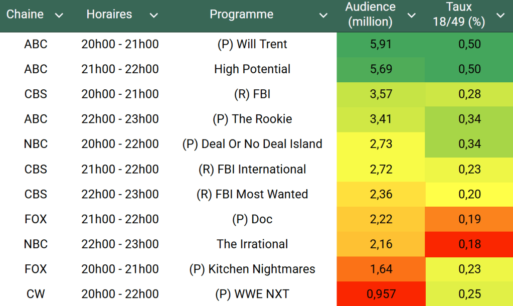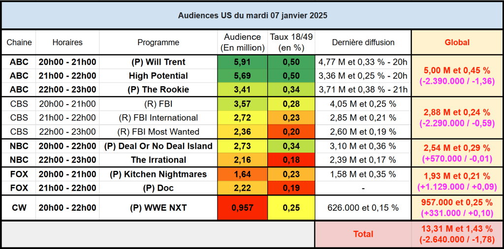 Audiences US du Mardi 07.01.25 : Enorme carton pour Will Trent et High Potential qui signent des record historiques sur ABC. The Rookie solide à 22h. Doc au dessus des 2 millions. CW au plus haut.