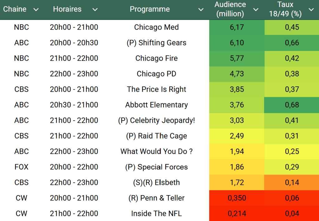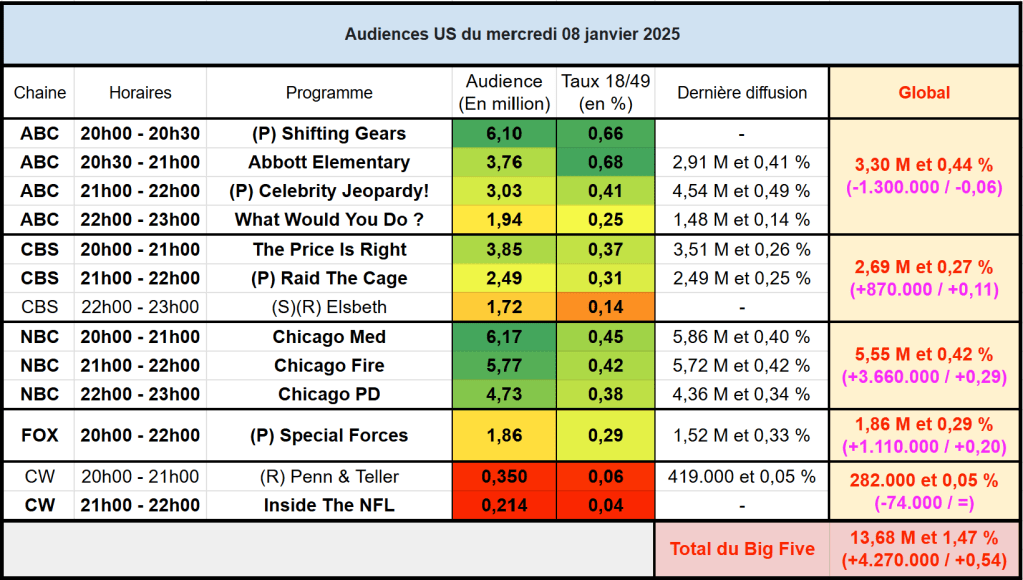 Audiences US du Mercredi 08.01.25 : Record de saison pour Chicago Med sur NBC. Gros carton pour Shifting Gears et Abbott Elementary sur ABC. Bon retour pour Raid The Cage et Special Forces. Celebrity Jeopardy en forte baisse.