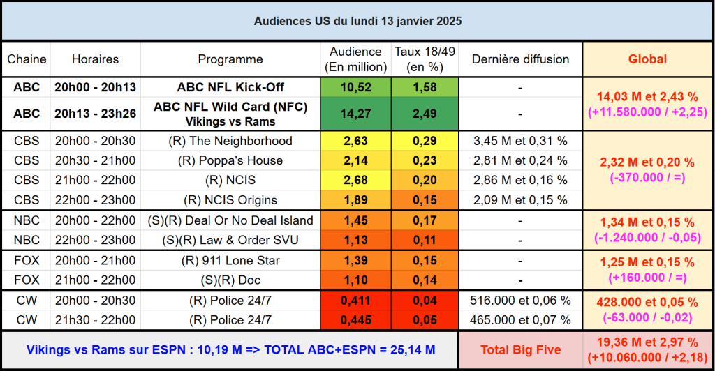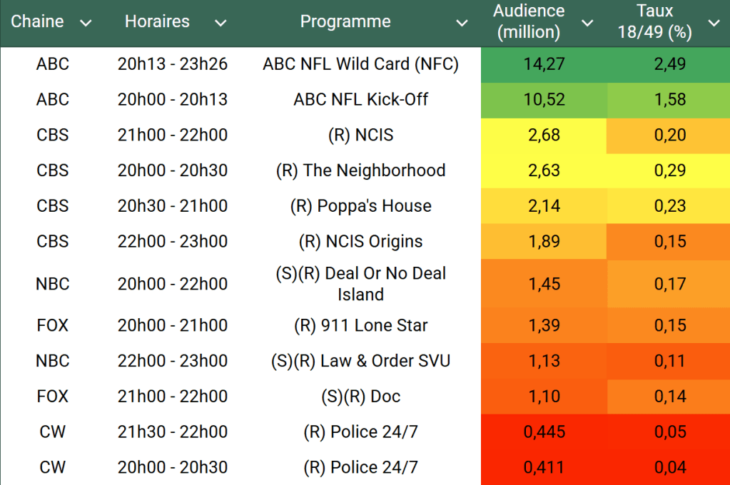 Audiences US du Lundi 13.01.25 : ABC très large leader avec la NFL. CBS est la meilleure des autres en dépassant les 2 millions. NBC très faible avec ses rediffusions. Thomas Fusil Communiqués Audiences US 16 janvier 2025 1 Minute Voici les audiences de la soirée du 13 Janvier Audiences triées (téléspectateurs) Partager : Partager sur X(ouvre dans une nouvelle fenêtre) X Partager sur Facebook(ouvre dans une nouvelle fenêtre) Facebook J’aime chargement… Similaire Publié par Thomas Fusil Voir tous les articles par Thomas Fusil Publié 16 janvier 2025