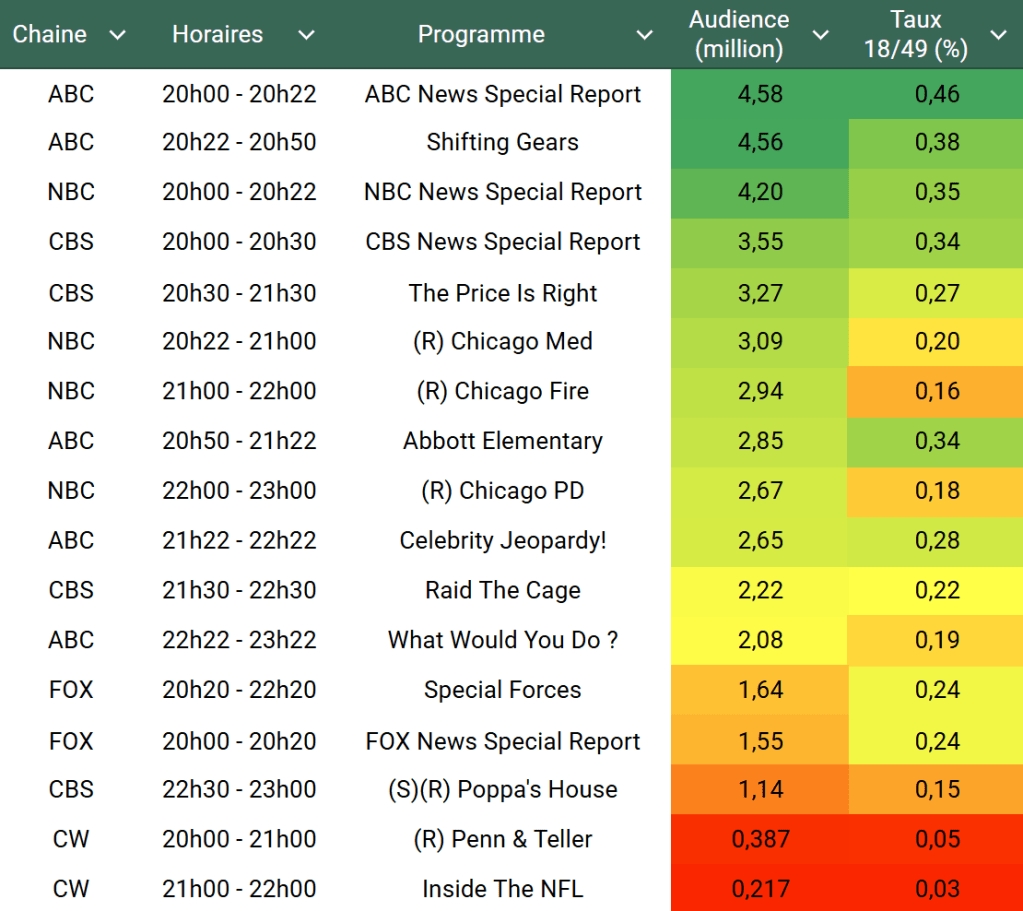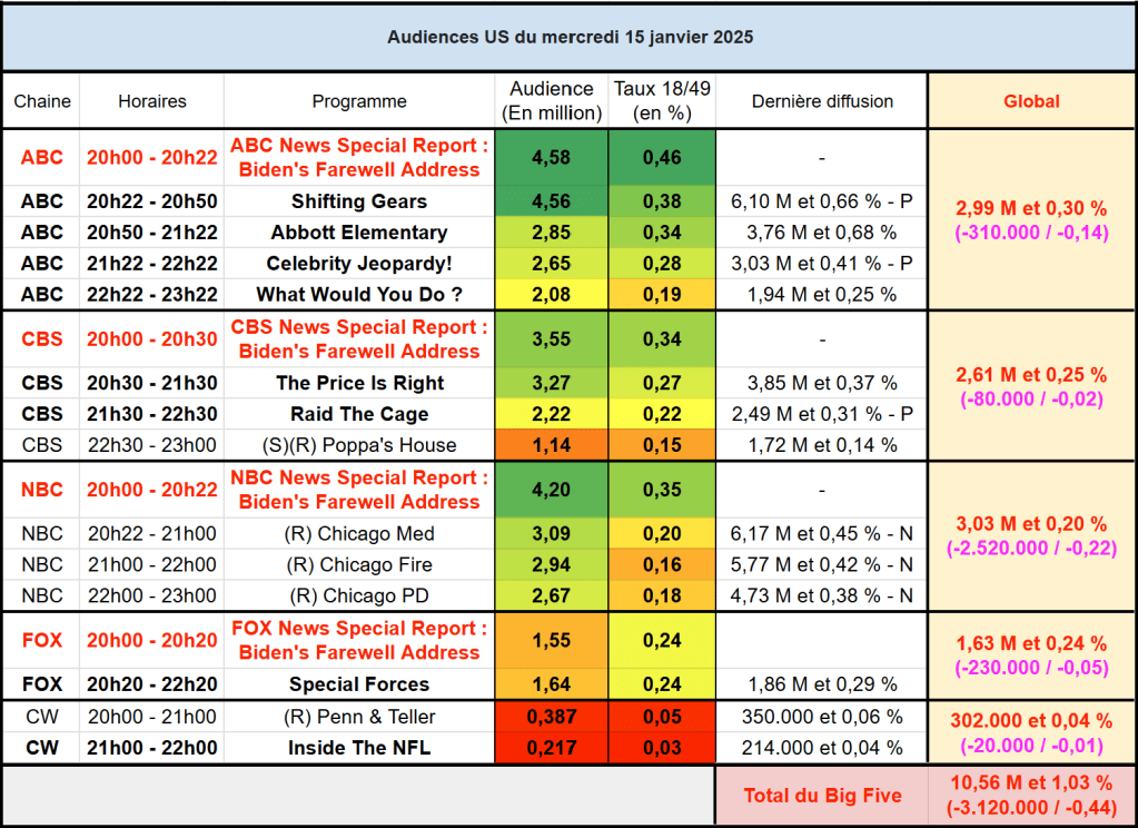 Audiences US du Mercredi 15.01.25 : Le dernier discours de Joe Biden leader sur ABC. NBC domine de justesse sur l’ensemble de la soirée. Les sitcoms de ABC solides malgré une forte baisse.