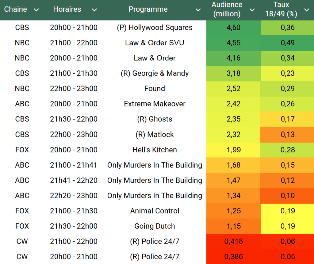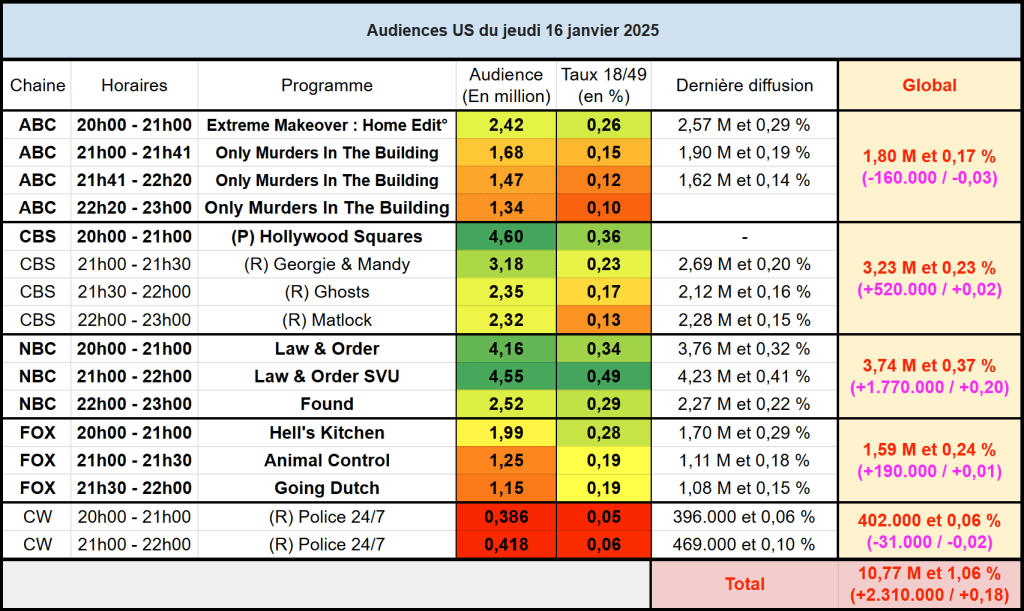 Audiences US du Jeudi 16.01.25 : Succès pour le lancement de Hollywood Squares sur CBS. Law & Order, Law & Order SVU, Found et Hell’s Kitchen au plus haut. ABC en très petite forme.