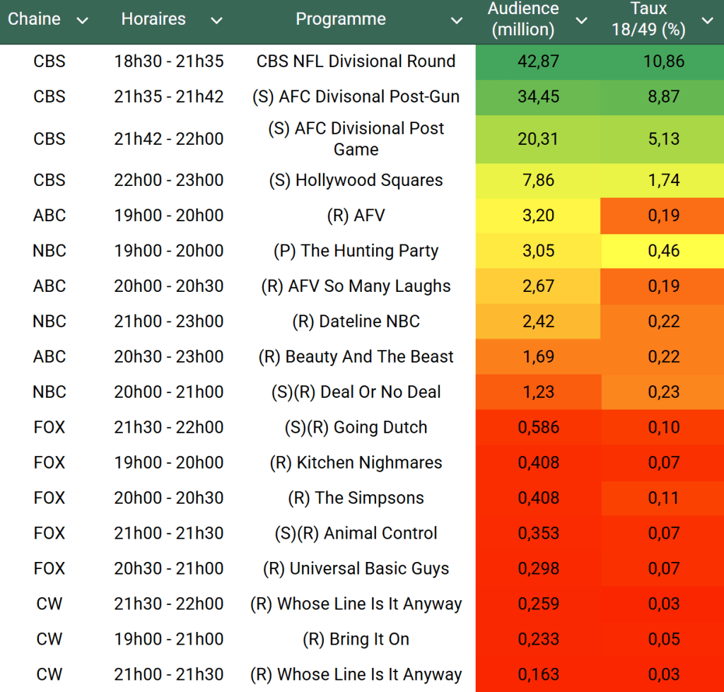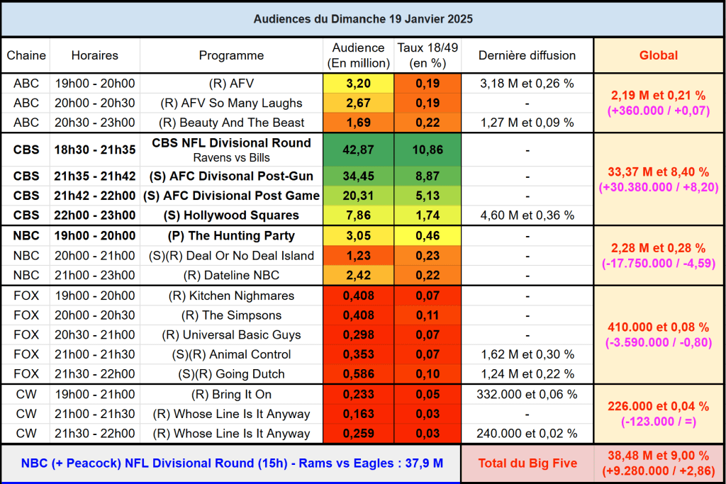 Audiences US du Dimanche 19.01.25 : CBS dépasse les 40 millions avec le match Ravens vs Bills. Hollywood Squares au top en post NFL. Début très mitigé pour The Hunting Party sur NBC. FOX très faible.