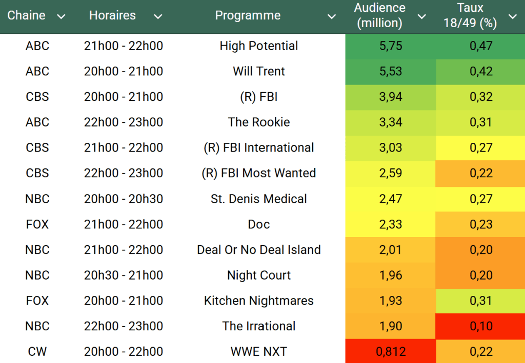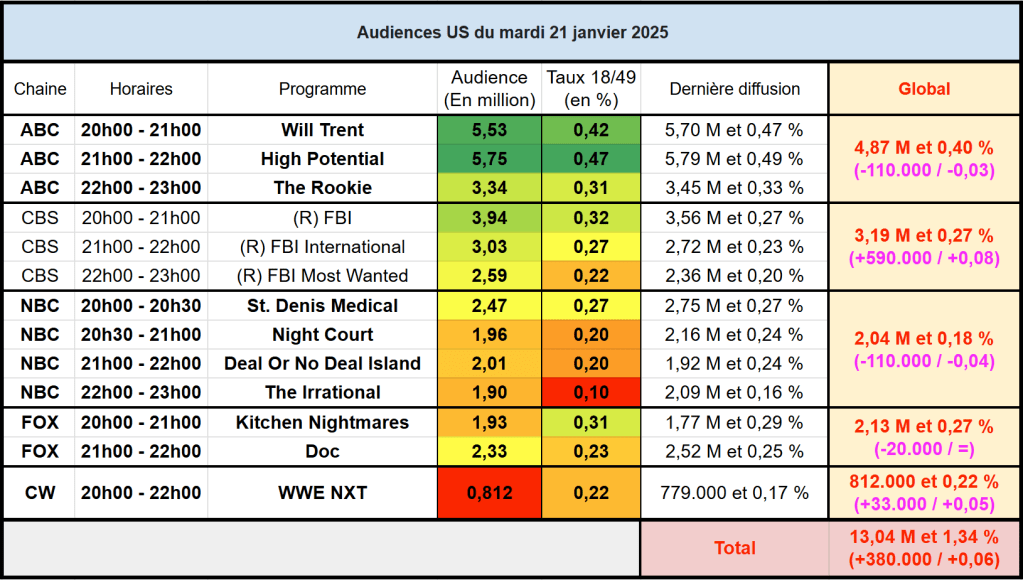 Audiences US du Mardi 21.01.25 : High Potential leader au top sur ABC. Will Trent très fort aussi. The Rookie domine sa tranche. St Denis Medical et Night Court au plus bas. Catastrophe pour The Irrational sur NBC.