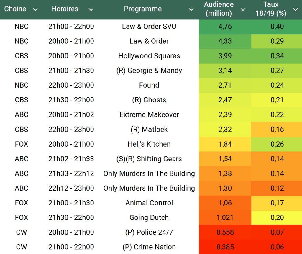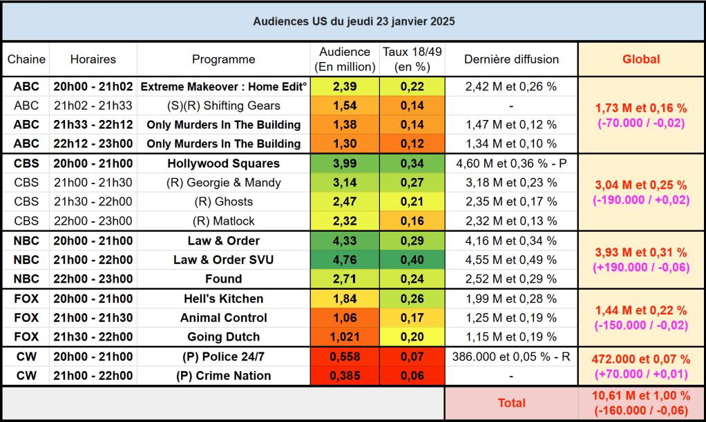 Audiences US du Jeudi 23.01.25 : Nouveau record de saison pour Law & Order, Law & Order SVU et Found sur NBC. Hollywood Squares solide mais en baisse. ABC n’est pas en grande forme.