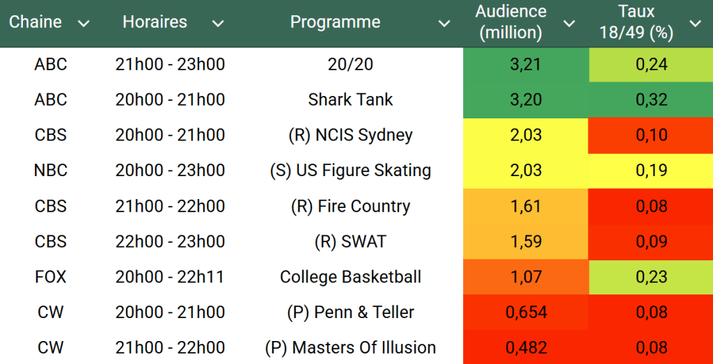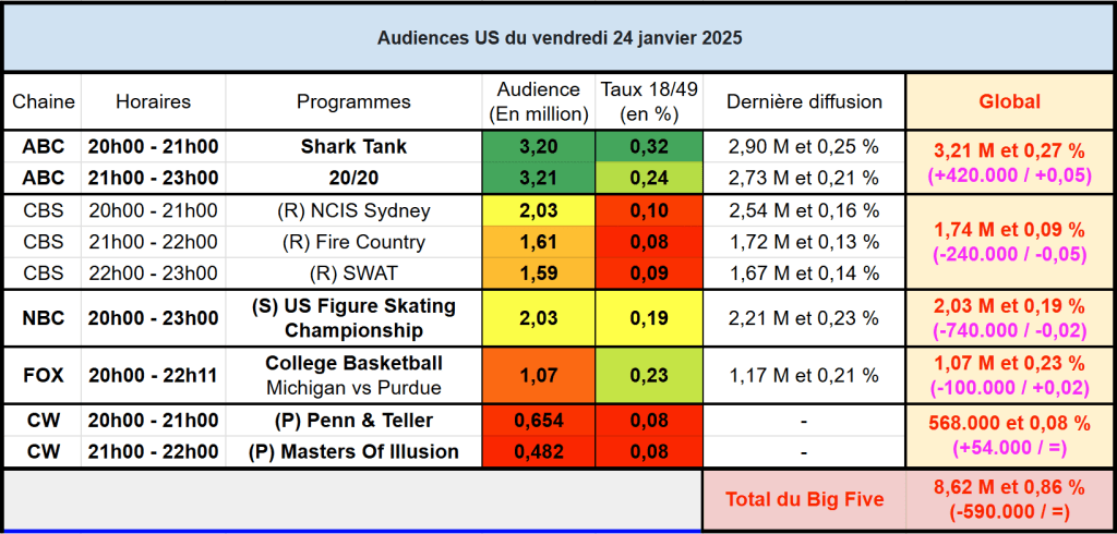 Audiences US du Vendredi 24.01.25 : Record de saison pour Shark Tank et 20/20 sur ABC. CBS très faible sur cible. Le patinage artistique en petite baisse sur un an. FOX tout juste au million.