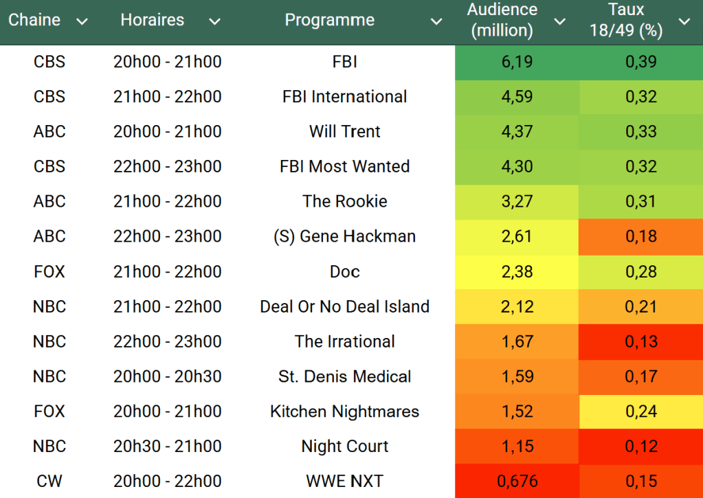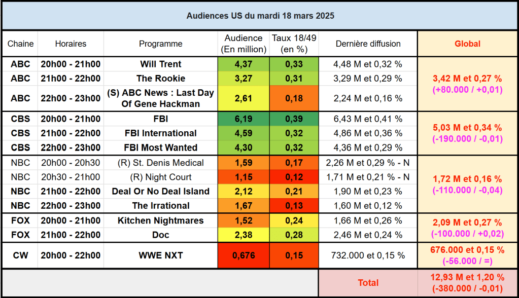 Audiences US du Mardi 18.03.25 : FBI toujours large leader. Will Trent et The Rookie fonctionnent bien. Doc au plus haut sur cible. NBC en souffrance. Thomas Fusil Communiqués Audiences US 20 mars 2025 1 Minute Voici les audiences de la soirée du 18 Mars Audiences triées (téléspectateurs) Partager : Partager sur X(ouvre dans une nouvelle fenêtre) X Partager sur Facebook(ouvre dans une nouvelle fenêtre) Facebook J’aime chargement… Similaire Publié par Thomas Fusil Voir tous les articles par Thomas Fusil Publié 20 mars 2025