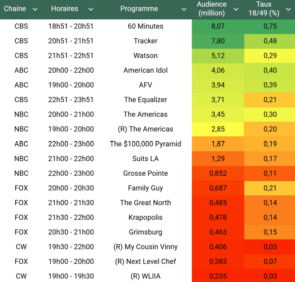 Audiences US du Dimanche 23.03.25 : Record historique pour la Formule 1 à 3h sur ESPN. 60 Minutes au plus haut de l’année sur CBS, porté par March Madness. La catastrophe se poursuit pour les séries de NBC.