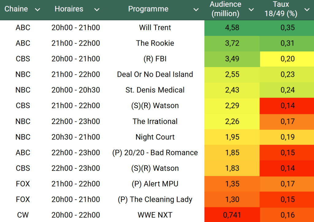 Audiences US du Mardi 25.03.25 : Will Trent leader en forme. The Rookie au plus haut sur ABC. Deal Or No Deal et The Irrational en hausse sur NBC. Cleaning Lady et Alert MPU à 1,3 millions sur FOX.