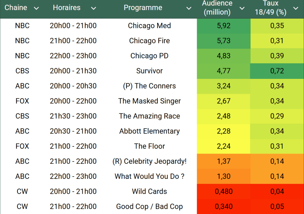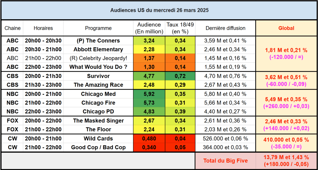 Audiences US du Mercredi 26.03.25 : Le One Chicago large leader sur NBC. Chicago PD est même en très belle forme. Record de saison pour Survivor. The Conners de retour à 3,2 millions.