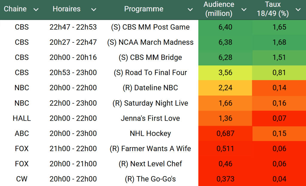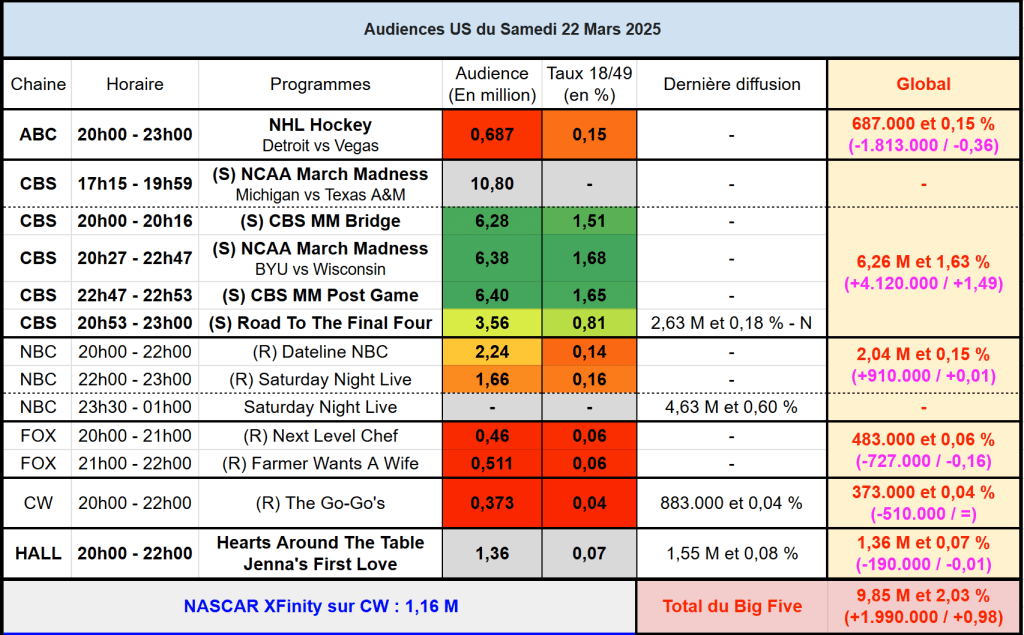 Audiences US du Samedi 22.03.25 : Carton pour March Madness sur CBS, qui écrase la concurrence. NBC s’en sort pas si mal. ABC et FOX nettement sous le million. Hallmark en baisse.