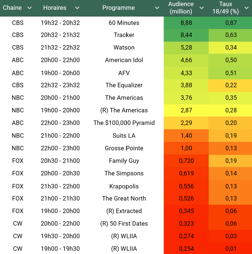 Audiences US du Dimanche 30.03.25 : Carton pour 60 Minutes, au plus haut de l’année. Tracker au plus haut historique sur cible. Watson et American Idol au plus haut. FOX et CW faibles le dimanche.