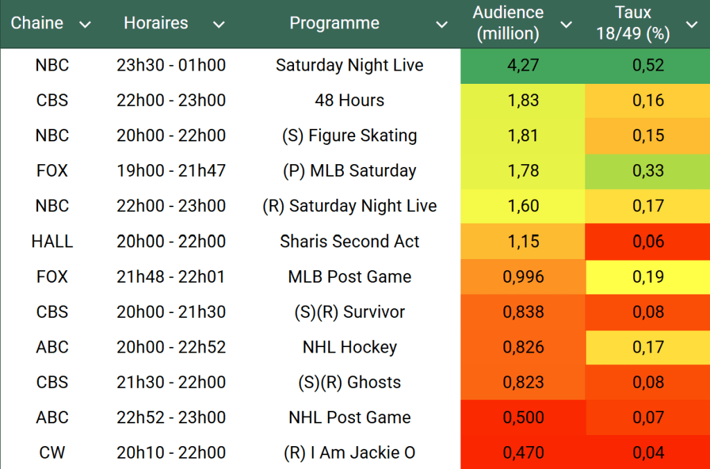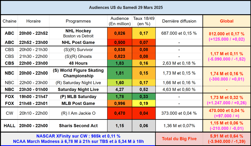 Audiences US du Samedi 29.03.25 : A 23h30, SNL fait plus du double du meilleur score en prime de ce samedi. Aucun programme ne dépasse les 2 millions. 48 Hours leader de justesse. FOX en forme avec le baseball.