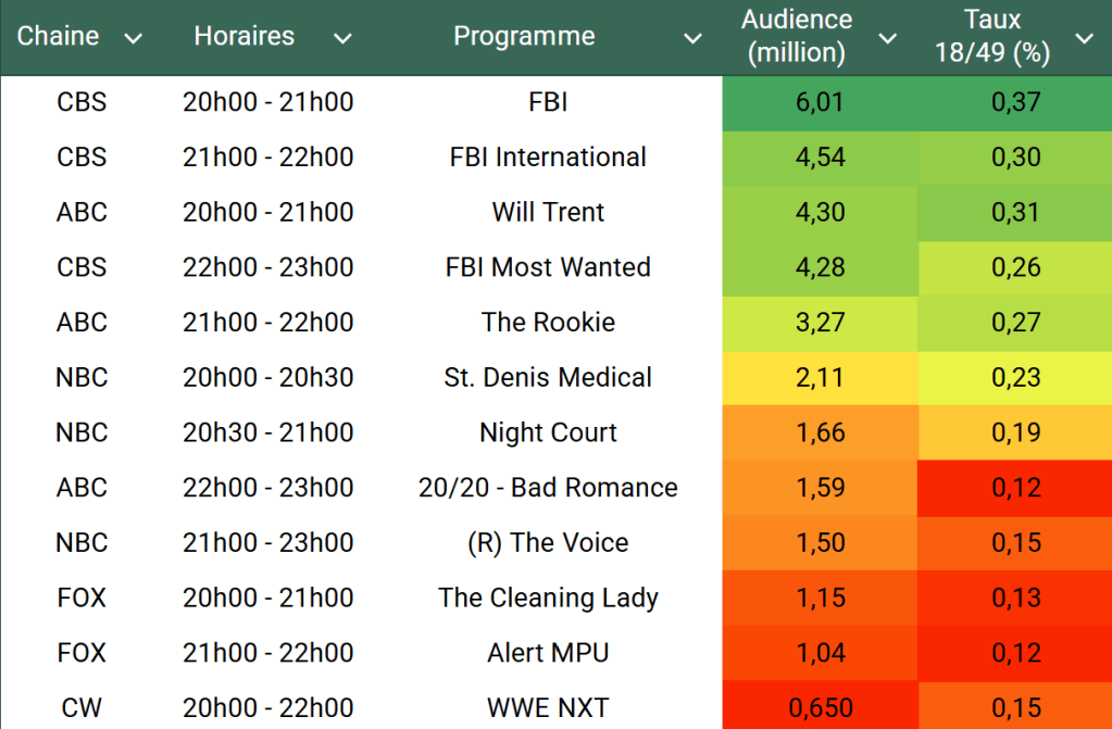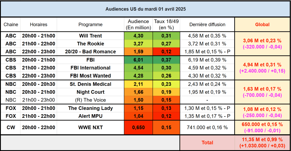 Audiences US du Mardi 01.04.25 : FBI large leader à 6 millions sur CBS. Will Trent et The Rookie solides mais en baisse. St Denis Medical au plus bas. FOX plonge déjà avec ses séries.