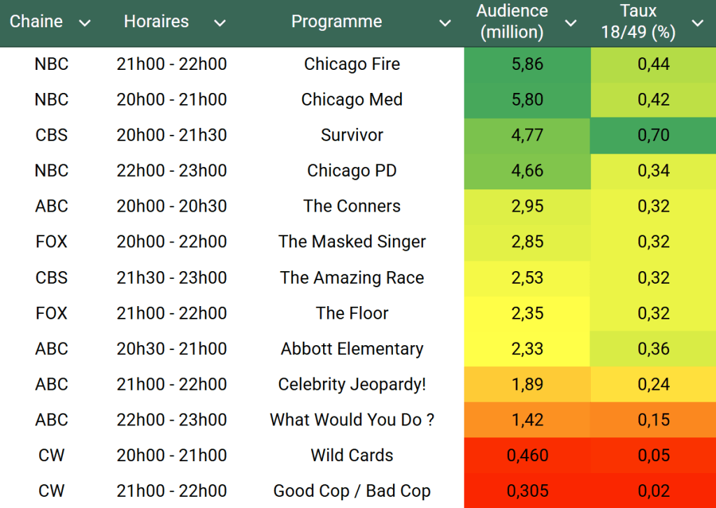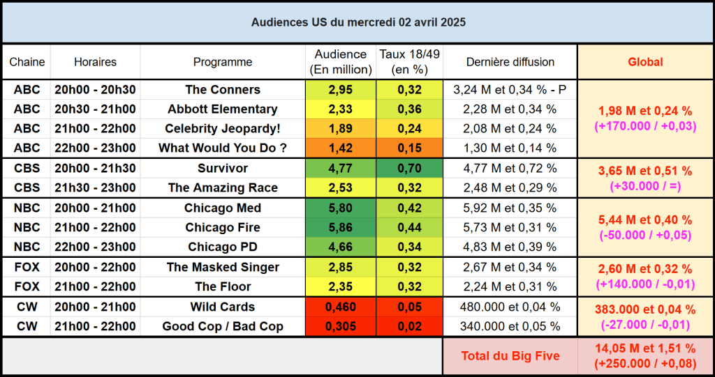 Audiences US du Mercredi 02.04.25 : Chicago Fire leader en forme. NBC domine largement avec les One Chicago. Survivor puissant sur cible. The Conners en baisse. Thomas Fusil Communiqués Audiences US 8 avril 2025 1 Minute Voici les audiences de la soirée du 2 Avril Audiences triées (téléspectateurs) Partager : Partager sur X(ouvre dans une nouvelle fenêtre) X Partager sur Facebook(ouvre dans une nouvelle fenêtre) Facebook J’aime chargement… Similaire Publié par Thomas Fusil Voir tous les articles par Thomas Fusil Publié 8 avril 2025