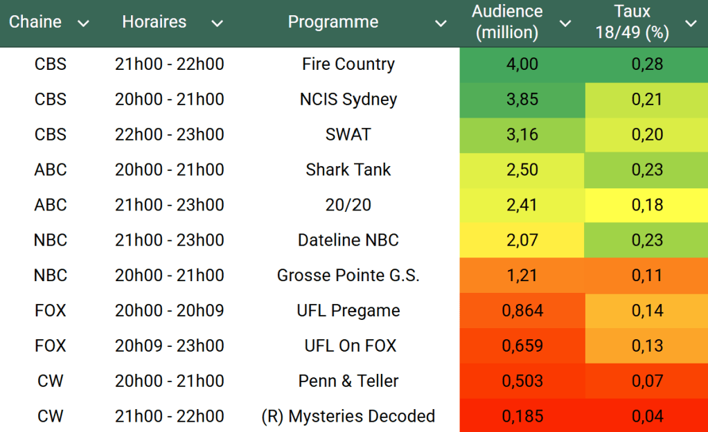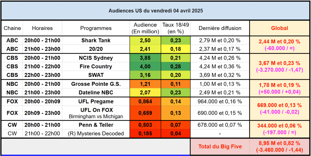 Audiences US du Vendredi 04.04.25 : Fire Country leader en petite forme. NCIS Sydney et SWAT au plus bas. Grosse Pointe reste un sévère échec malgré le changement de case. UFL faible sur FOX.