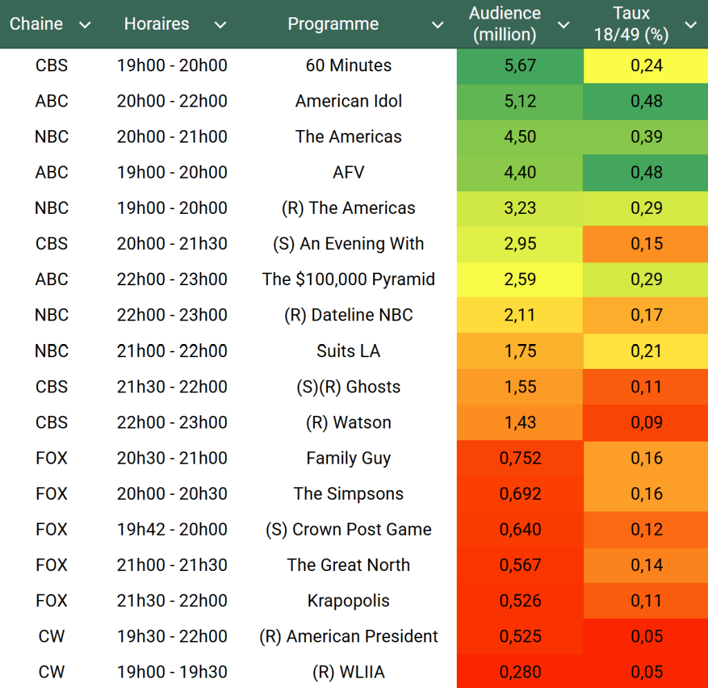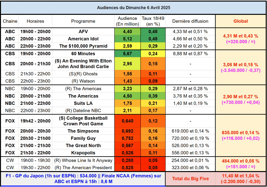 Audiences US du Dimanche 06.04.25 : 60 Minutes leader en chute libre. American Idol au plus haut sur ABC, dépasse les 5 millions. Succès pour le doc animalier The Americas sur NBC. Suits LA remonte mais reste sous les 2 millions