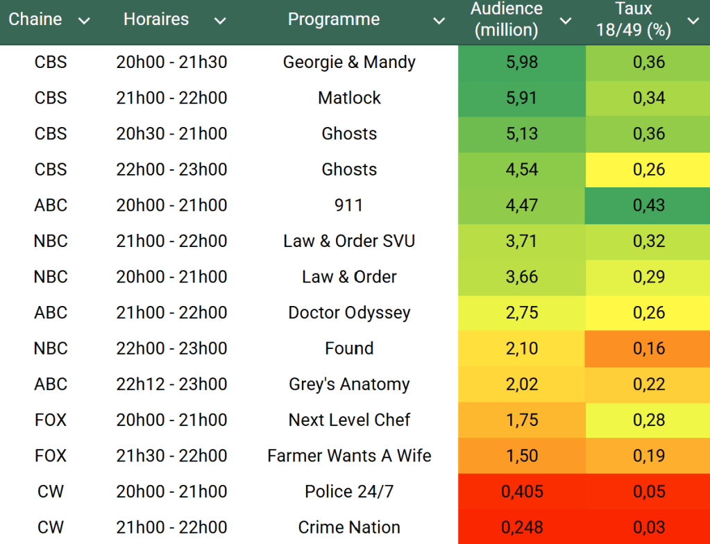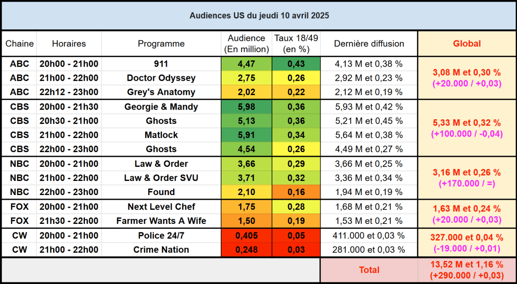 Audiences US du Jeudi 10.04.25 : Georgie & Mandy et Matlock au coude à coude un peu en dessous des 6 millions. 911 en hausse et leader sur cible. Law & Order SVU et Found progressent aussi.