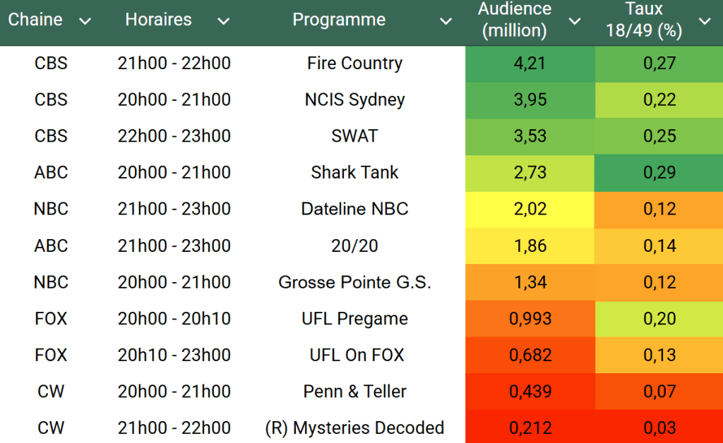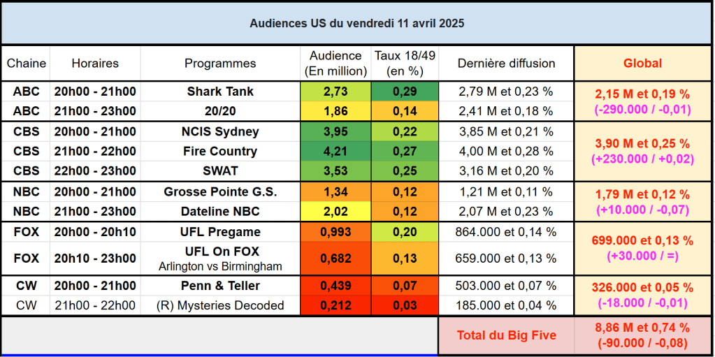Audiences US du Vendredi 11.04.25 : Fire Country leader en hausse, repasse la barre des 4 millions. NCIS Sydney et SWAT progressent. 20/20 et Dateline faibles. Thomas Fusil Communiqués Audiences US 15 avril 2025 1 Minute Voici les audiences de la soirée du 11 Avril Audiences triées (téléspectateurs) Partager : Partager sur X(ouvre dans une nouvelle fenêtre) X Partager sur Facebook(ouvre dans une nouvelle fenêtre) Facebook J’aime chargement… Similaire Publié par Thomas Fusil Voir tous les articles par Thomas Fusil Publié 15 avril 2025