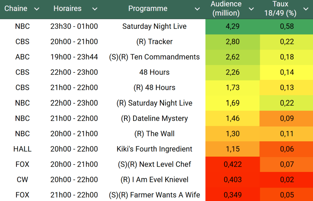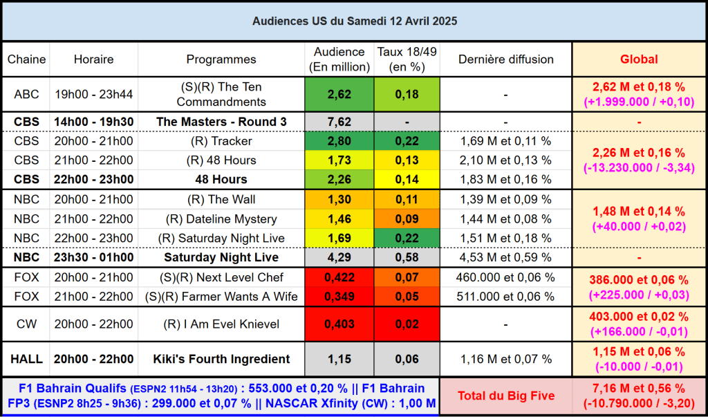 Audiences US du Samedi 12.04.25 : Portée par le golf, la rediffusion de Tracker s’impose en tête à 20h sur CBS. ABC domine l’ensemble de la soirée avec son film. CW une nouvelle fois devant FOX.
