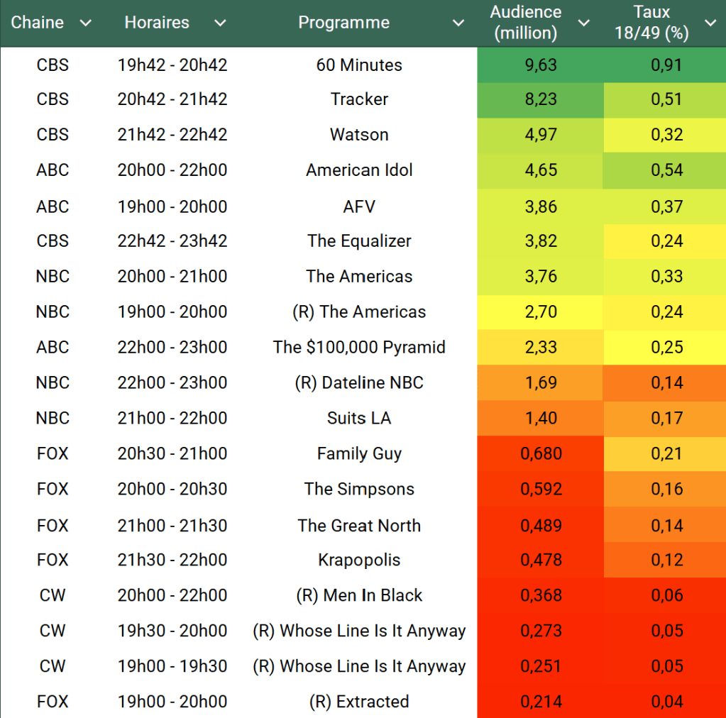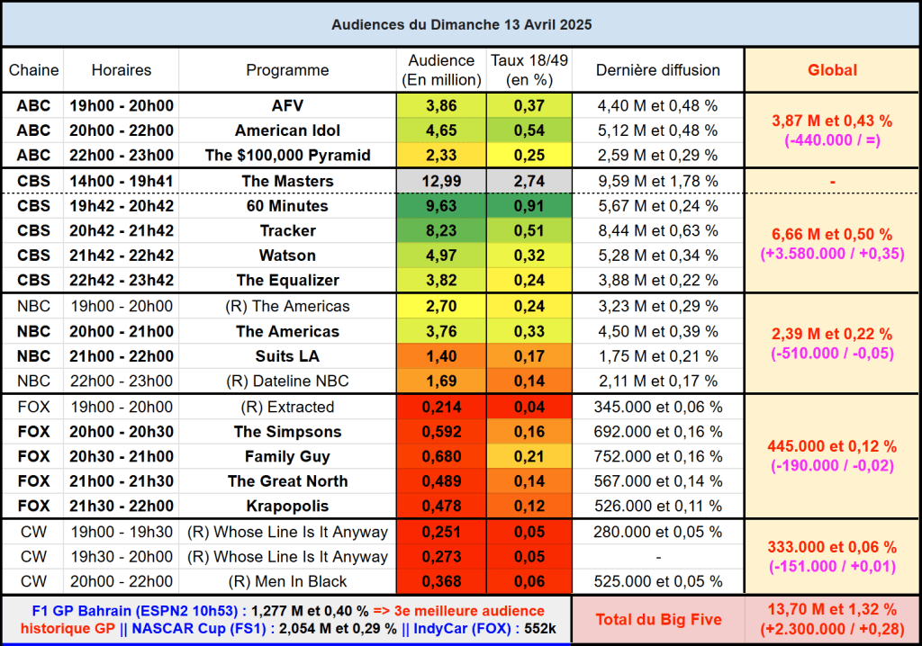 Audiences US du Dimanche 13.04.25 : Carton pour The Masters sur CBS, au plus haut depuis 2018. Boosté par le golf, 60 Minutes est au plus haut depuis novembre 2024. Tracker au dessus des 8 millions. Suits LA toujours faible.