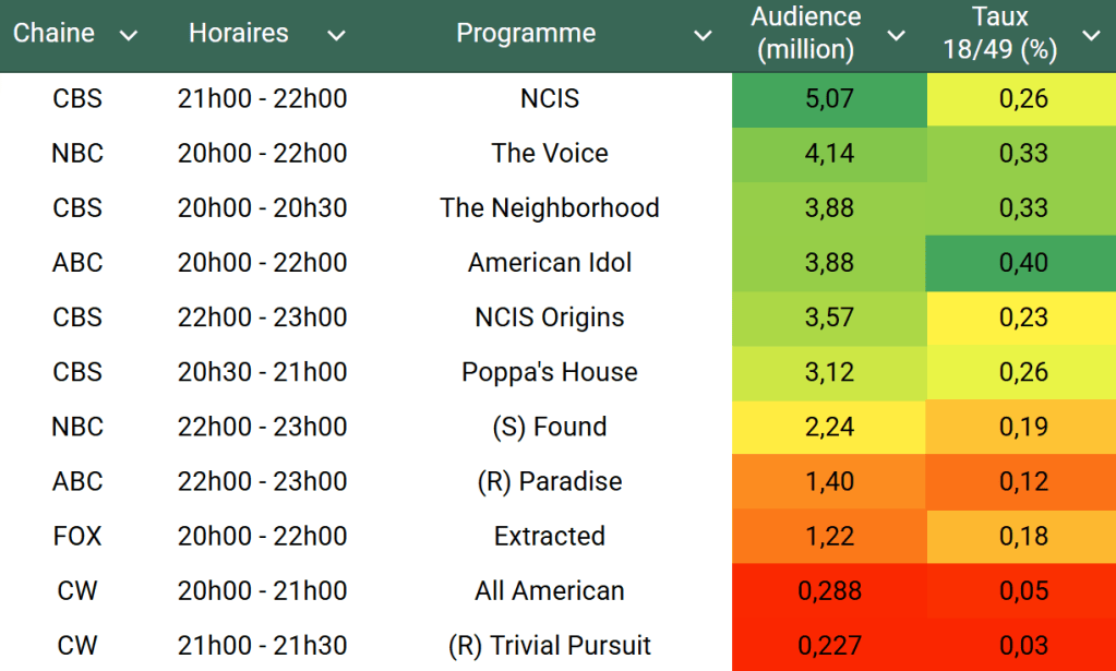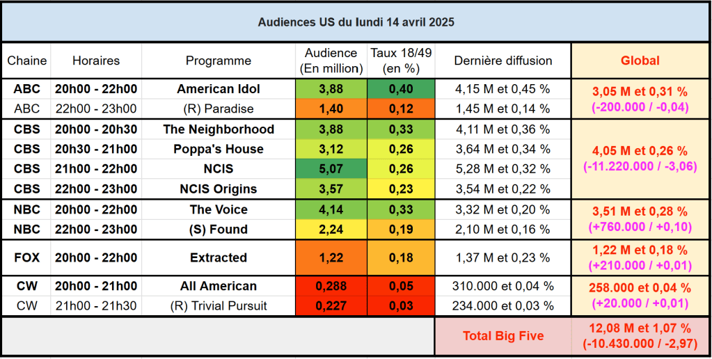 Audiences US du Lundi 14.04.25 : NCIS se maintient au dessus des 5 millions et domine sur CBS. The Voice remonte mais reste bas et battu par American Idol sur cible. FOX faible.