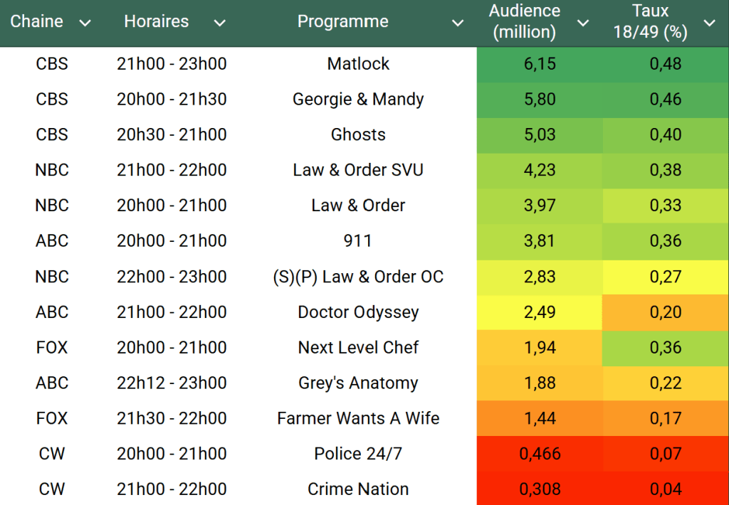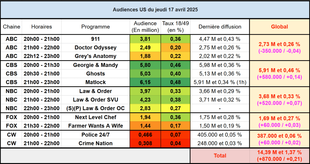 Audiences US du Jeudi 17.04.25 : Soirée très solide pour CBS. Succès pour le final de Matlock, au dessus des 6 millions et au plus haut sur cible. Grosse baisse surprenante pour l’épisode choc de 911. NBC solide avec sa franchise.