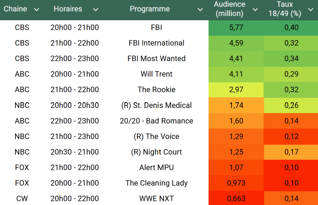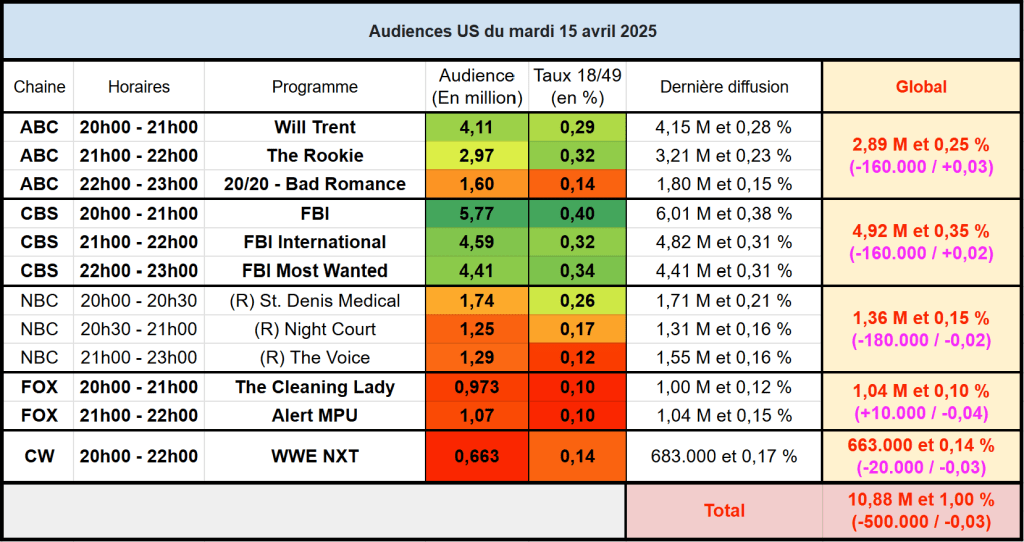Audiences US du Mardi 15.04.25 : Le trio FBI très large leader sur CBS. The Rookie au plus haut depuis Janvier sur cible. NBC souffre en rediffusion. FOX très faible avec ses séries.