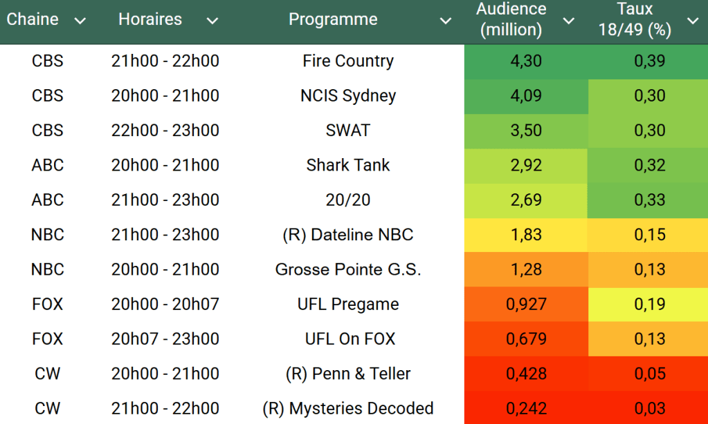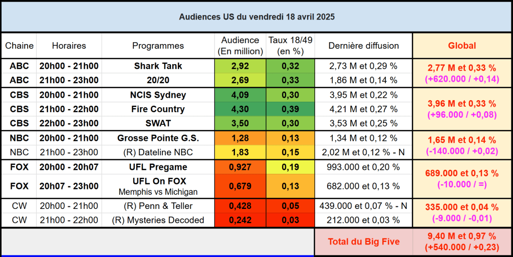 Audiences US du Vendredi 18.04.25 : Fire Country leader en hausse sur tous les critères. NCIS Sydney repasse au dessus des 4 millions. 20/20 au plus haut depuis le 2 Février 2024 sur cible. FOX faible.