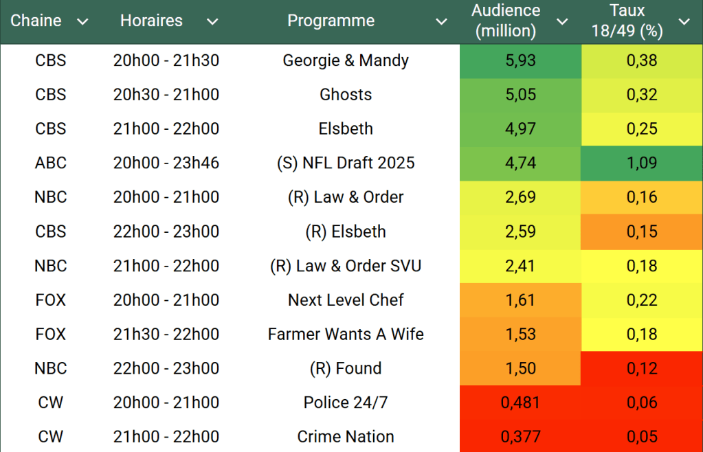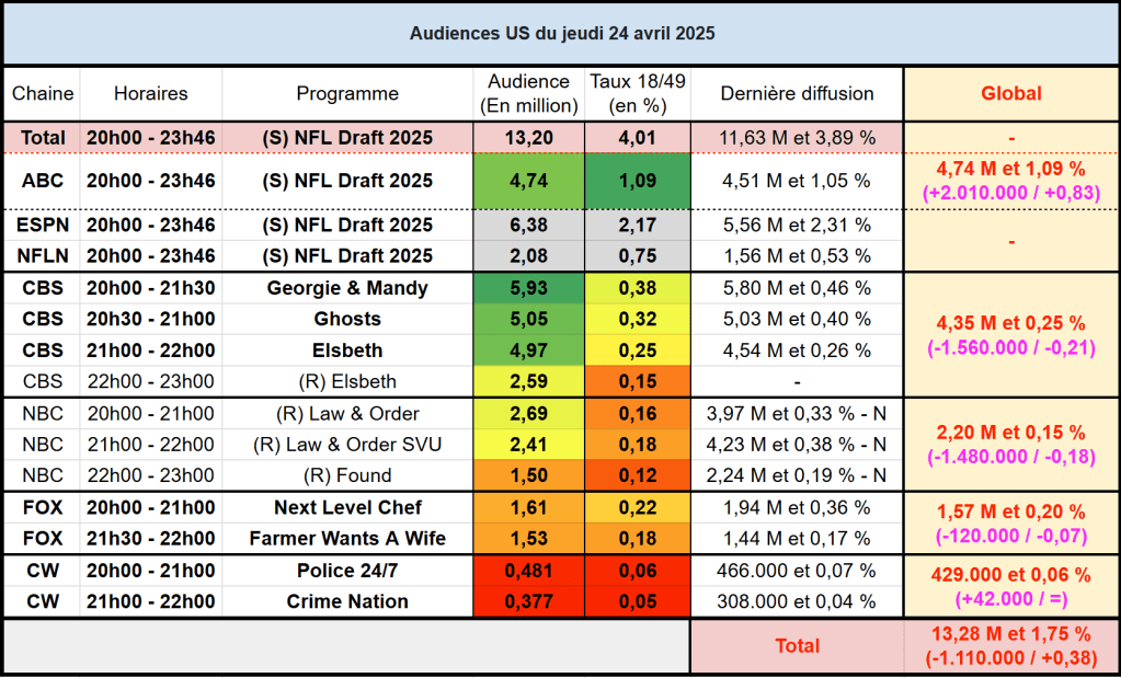 Audiences US du Jeudi 24.04.25 : Georgie & Mandy leader en hausse. Record de saison pour Elsbeth. Succès pour NFL Draft en hausse sur toutes les chaines sur un an. Thomas Fusil Communiqués Audiences US 27 avril 2025 1 Minute Voici les audiences de la soirée du 24 Avril Audiences triées (téléspectateurs) Partager : Partager sur X(ouvre dans une nouvelle fenêtre) X Partager sur Facebook(ouvre dans une nouvelle fenêtre) Facebook J’aime chargement… Similaire Publié par Thomas Fusil Voir tous les articles par Thomas Fusil Publié 27 avril 2025