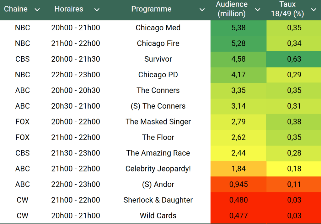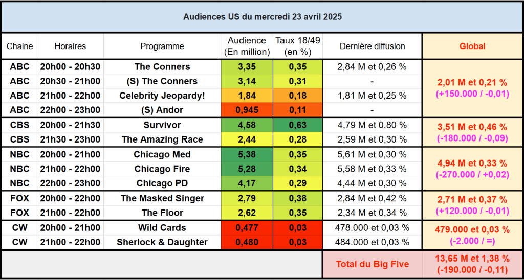 Audiences US du Mercredi 23.04.25 : Le One Chicago leader en baisse sur NBC. Record de saison pour The Conners. 3e meilleure audience historique (hors NFL) pour The Floor sur FOX.