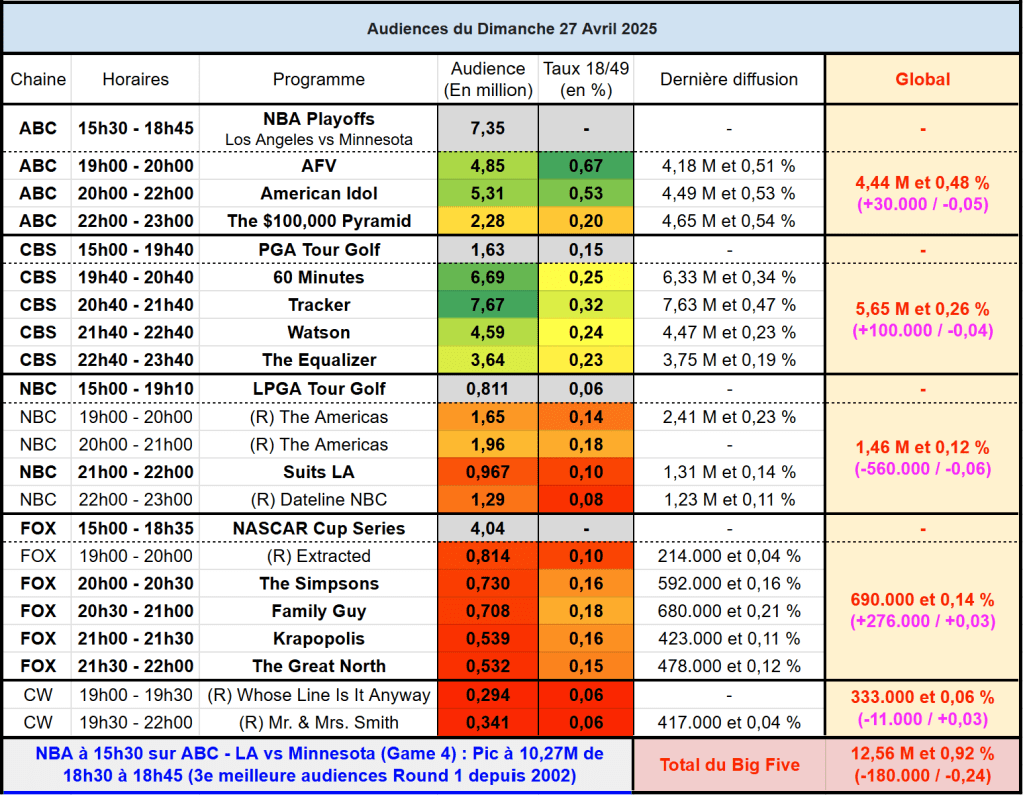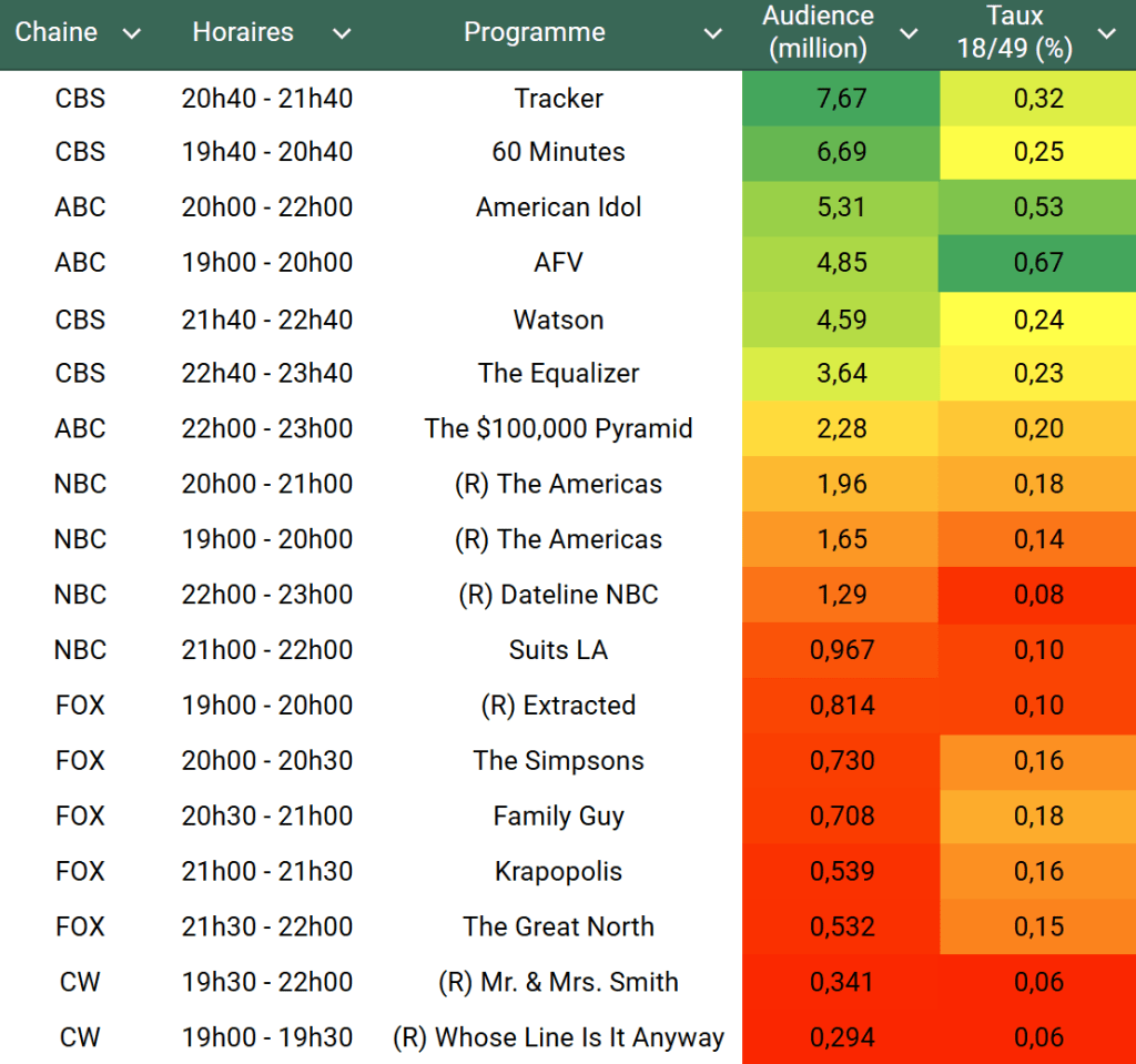 Audiences US du Dimanche 27.04.25 : Tracker large leader. En post NBA, AFV est au plus depuis Mai 2023 sur cible et American Idol signe son record de saison. Catastrophe pour Suits LA qui passe sous le million.