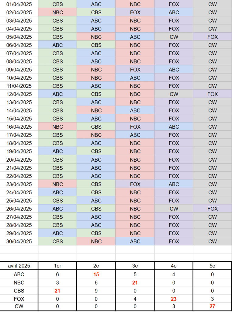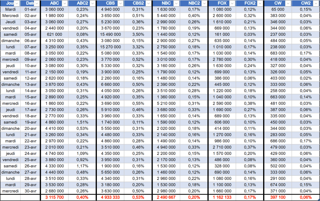 Moyennes des audiences primes (téléspectateurs et cible 18/49 ans) de ABC, CBS, NBC, FOX et CW en Avril 2025