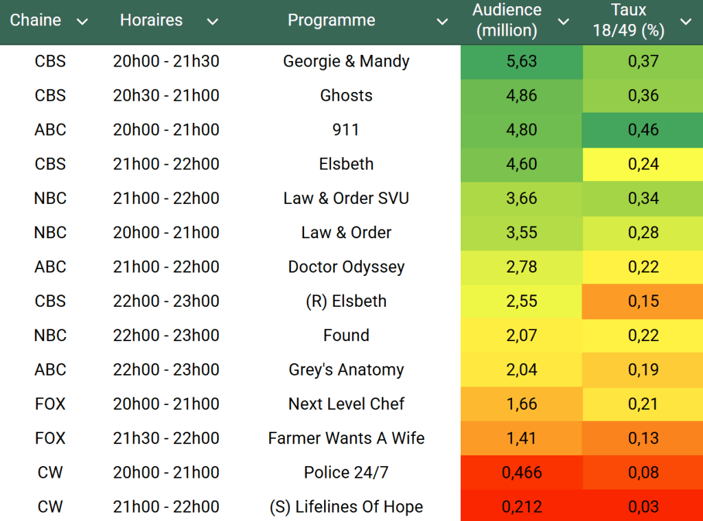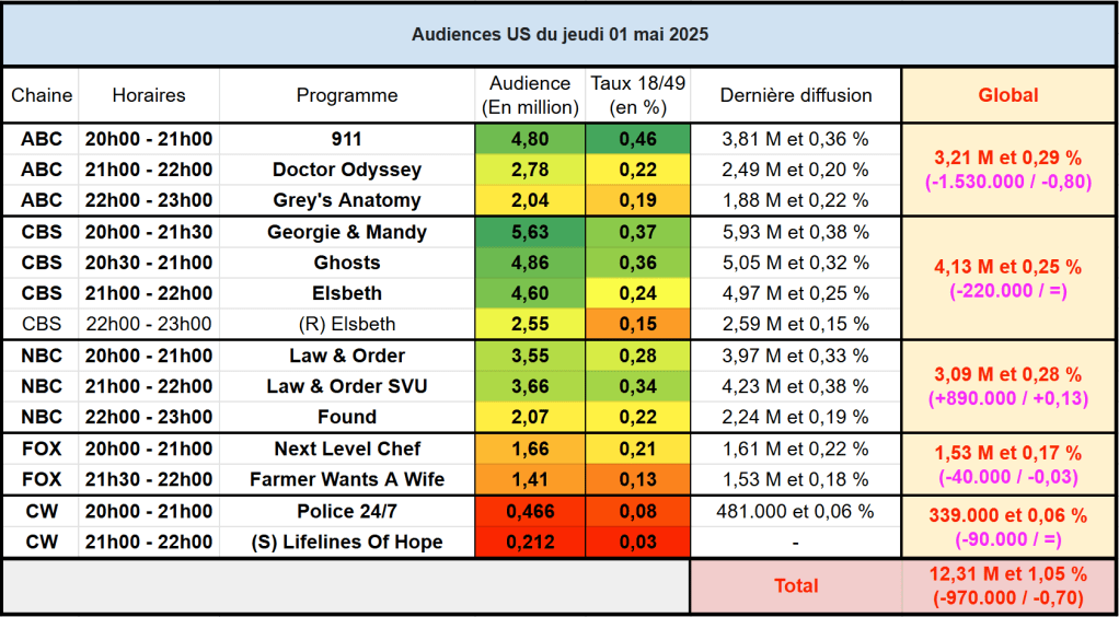 Audiences US du Jeudi 01.05.25 : Georgie & Mandy leader en baisse. Succès pour 911 en grande forme sur ABC. Doctor Odyssey et Grey’s Anatomy en hausse. Police 24/7 en forme sur CW.