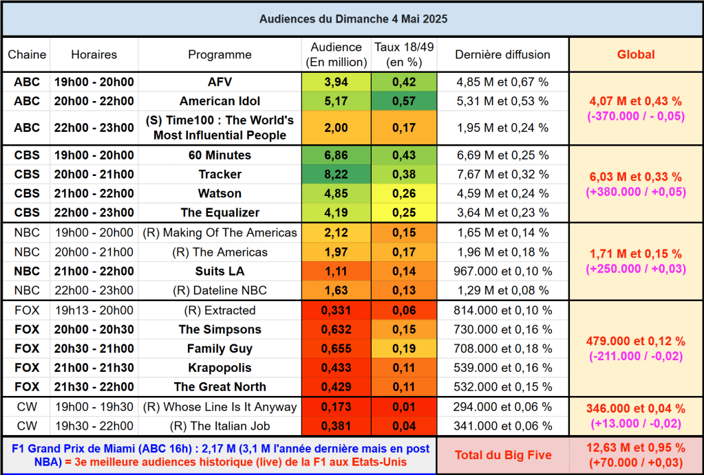 Audiences US du Dimanche 04.05.25 : Carton pour Tracker au dessus des 8 millions. The Equalizer termine en hausse. Record de saison sur cible pour American Idol. FOX faible.