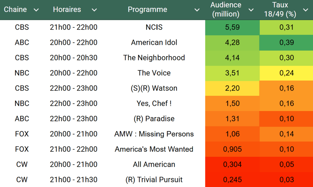Audiences US du Lundi 05.05.25 : NCIS large leader pour son final sur CBS. American Idol surclasse toujours The Voice, de nouveau au plus bas. FOX sous le million. Thomas Fusil Communiqués Audiences US 9 Mai 2025 1 Minute Voici les audiences de la soirée du 5 Mai Audiences triées (téléspectateurs) Partager : Partager sur X(ouvre dans une nouvelle fenêtre) X Partager sur Facebook(ouvre dans une nouvelle fenêtre) Facebook J’aime chargement… Similaire Publié par Thomas Fusil Voir tous les articles par Thomas Fusil Publié 9 Mai 2025