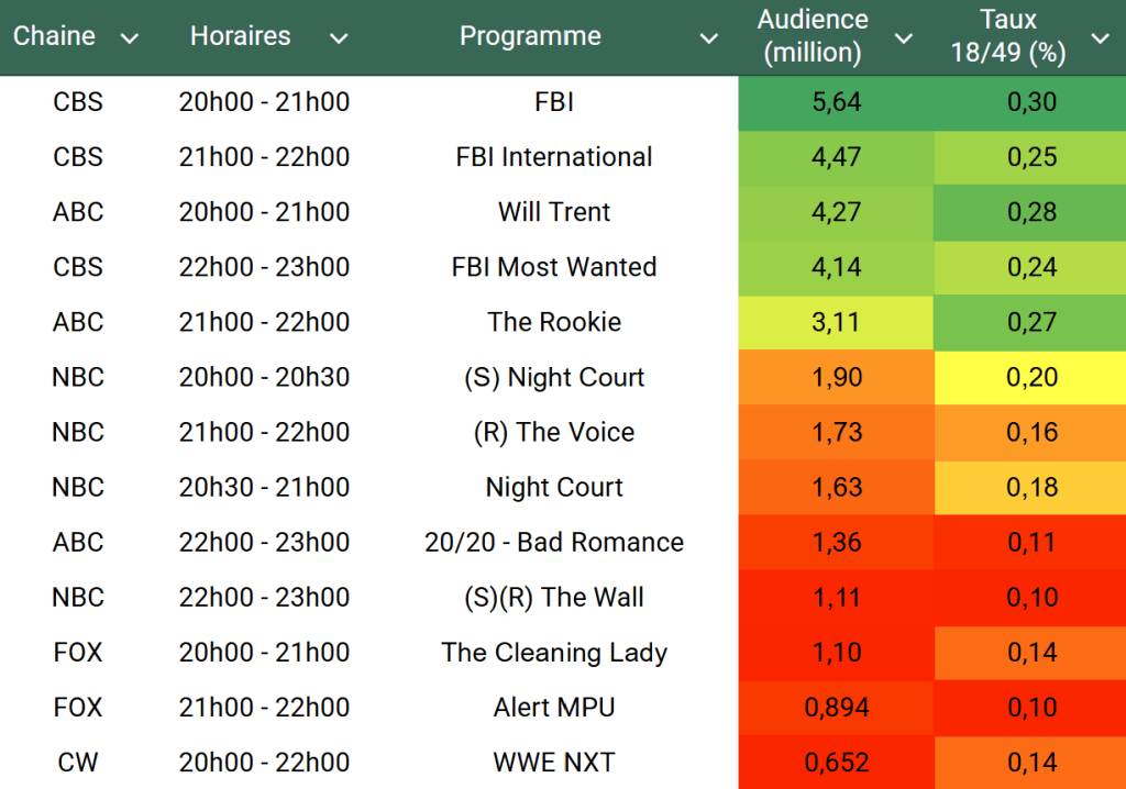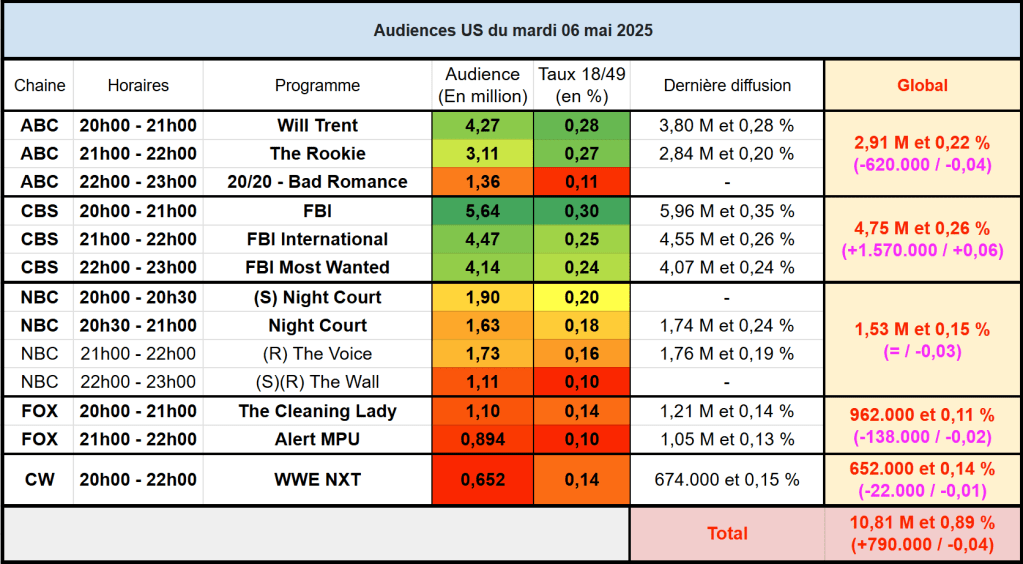 Audiences US du Mardi 06.05.25 : FBI large leader sur CBS. Will Trent en hausse. The Rookie repasse au dessus des 3 millions. Night Court faible pour son final. FOX de nouveau sous le million.