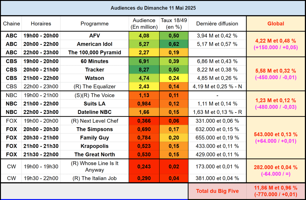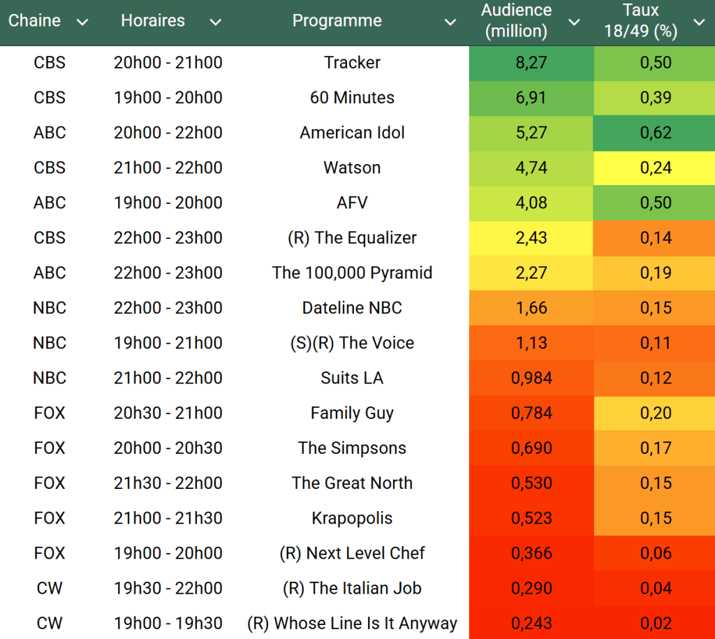 Audiences US du Dimanche 11.05.25 : Carton pour Tracker, très large leader au dessus des 8 millions. Succès aussi pour American Idol, au plus haut sur cible. Suits LA sous le million. FOX faible.