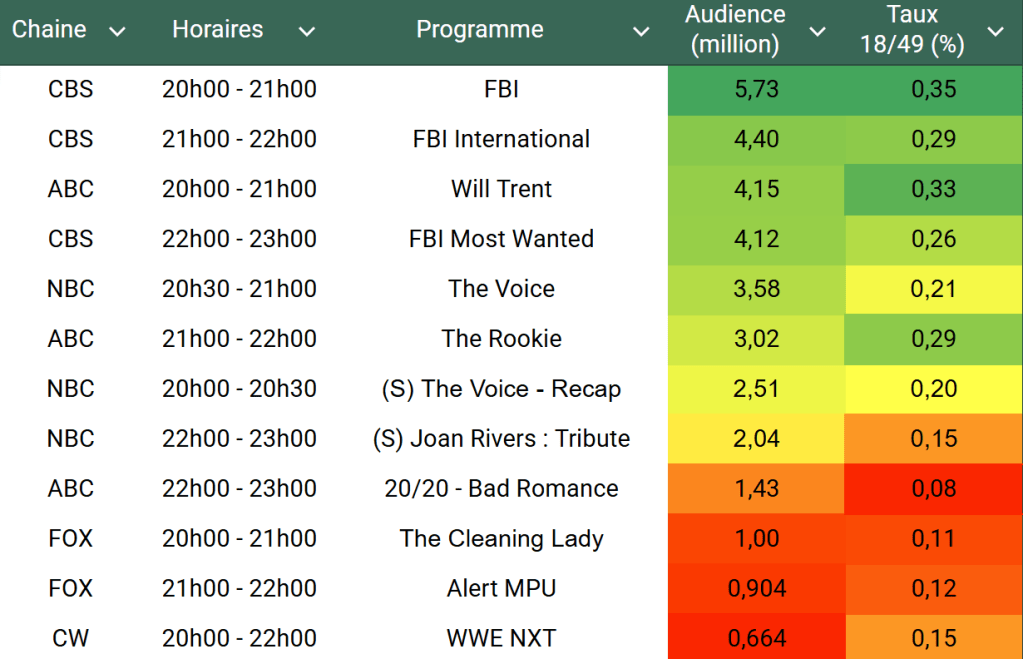 Audiences US du Mardi 13.05.25 : FBI large leader en hausse. Will Trent et The Rookie terminent bien. The Voice toujours nettement sous les 4 millions. FOX sous le million.