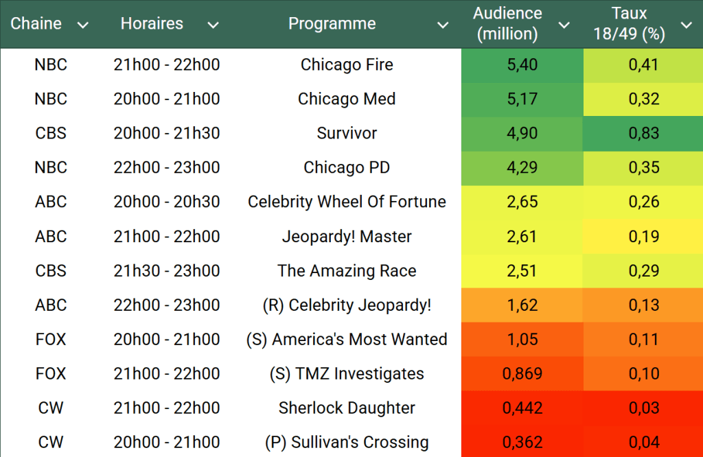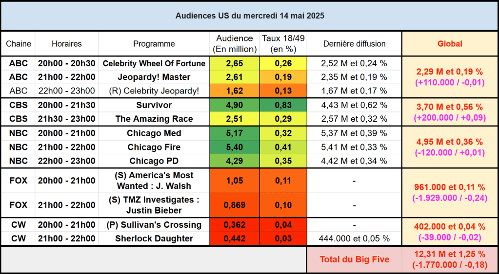 Audiences US du Mercredi 14.05.25 : Chicago Fire bon leader sur NBC. Carton pour Survivor au plus haut sur tous les indicateurs et surpuissant sur cible. ABC remonte. FOX de nouveau sous le million.
