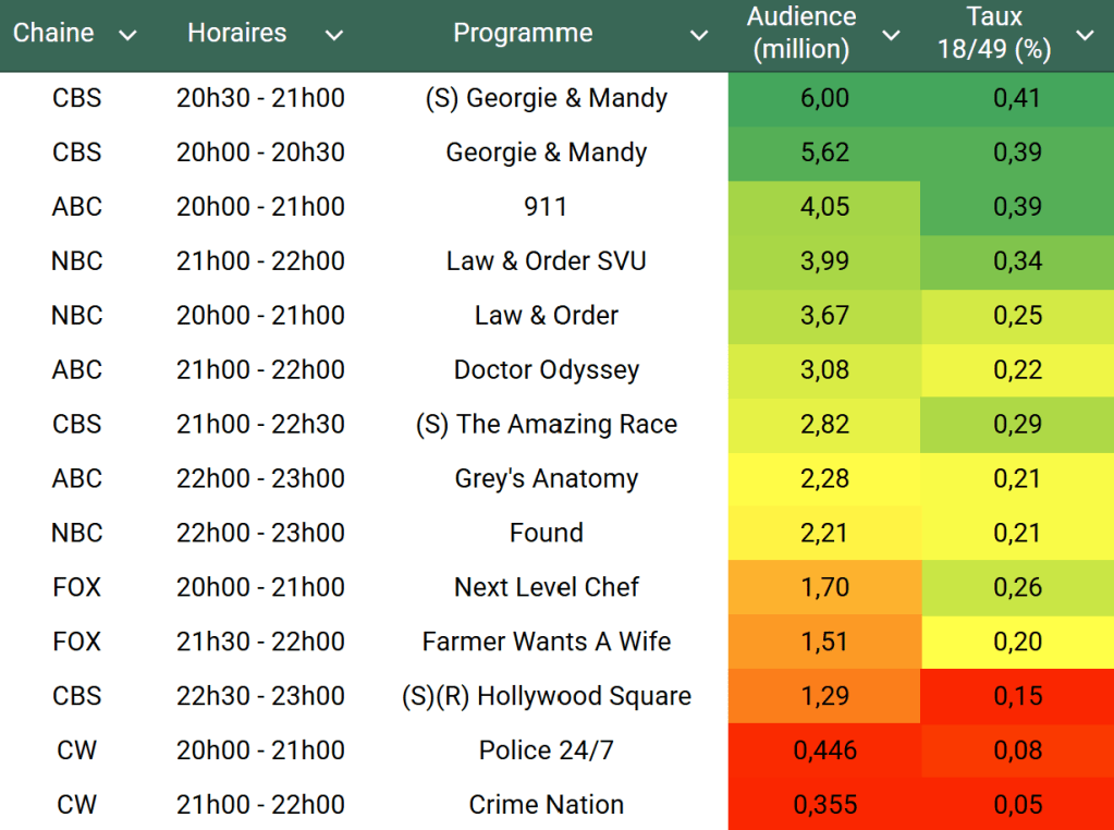Audiences US du Jeudi 15.05.25 : Georgie & Mandy très bon leader pour son final, au plus haut depuis début mars. Doctor Odyssey termine en forte hausse, tout comme Law & Order SVU. 911 solide.