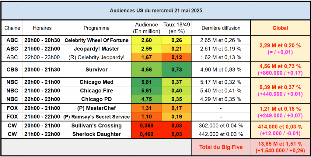 Audiences US du Mercredi 21.05.25 : Le One Chicago, emmené par Chicago Med, signe une belle hausse pour son final. Survivor puissant sur cible. FOX sans éclat avec ses divertissements.