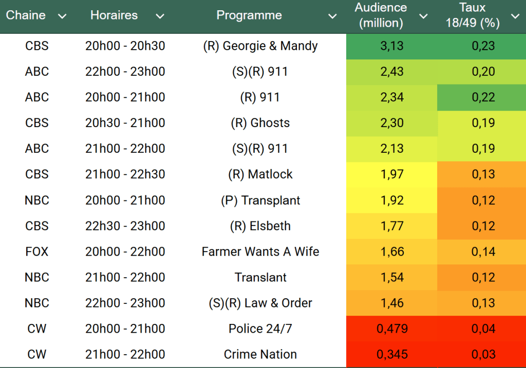 Audiences US du Jeudi 22.05.25 : ABC leader surprise avec ses rediffusions de 911. Transplant démarre sous les 2 millions. FOX en légère progression. Thomas Fusil Communiqués Audiences US 26 Mai 2025 1 Minute Voici les audiences de la soirée du 22 Mai Audiences triées (téléspectateurs) Partager : Partager sur X(ouvre dans une nouvelle fenêtre) X Partager sur Facebook(ouvre dans une nouvelle fenêtre) Facebook J’aime chargement… Similaire Publié par Thomas Fusil Voir tous les articles par Thomas Fusil Publié 26 Mai 2025