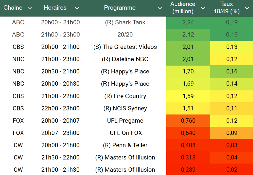 Audiences US du Vendredi 23.05.25 : Shark Tank leader en rediffusion sur ABC. The Greatest Videos en baisse. NBC s’en sort relativement pas trop mal en ce vendredi de Memorial Day Weekend.