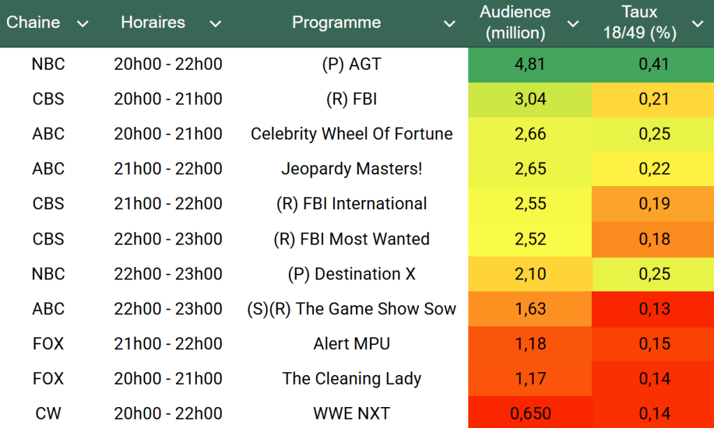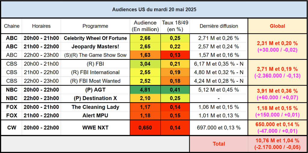 Audiences US du Mardi 27.05.25 : AGT large leader sur NBC. Démarrage compliqué pour Destination X. FOX en petite hausse sans la concurrence des séries de CBS. Thomas Fusil Communiqués Audiences US 31 Mai 2025 1 Minute Voici les audiences de la soirée du 27 Mai Audiences triées (téléspectateurs) Partager : Partager sur X(ouvre dans une nouvelle fenêtre) X Partager sur Facebook(ouvre dans une nouvelle fenêtre) Facebook J’aime chargement… Similaire Publié par Thomas Fusil Voir tous les articles par Thomas Fusil Publié 31 Mai 2025