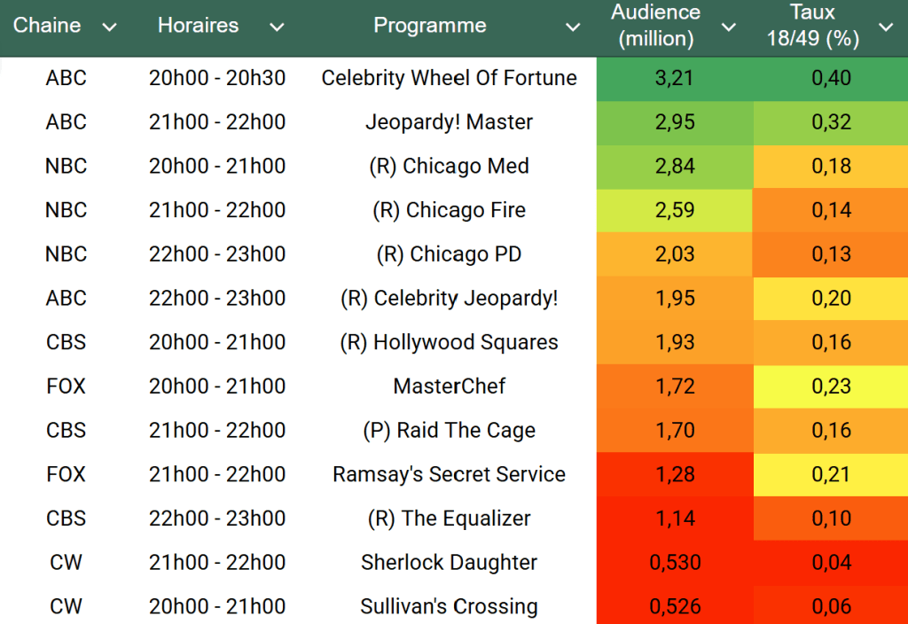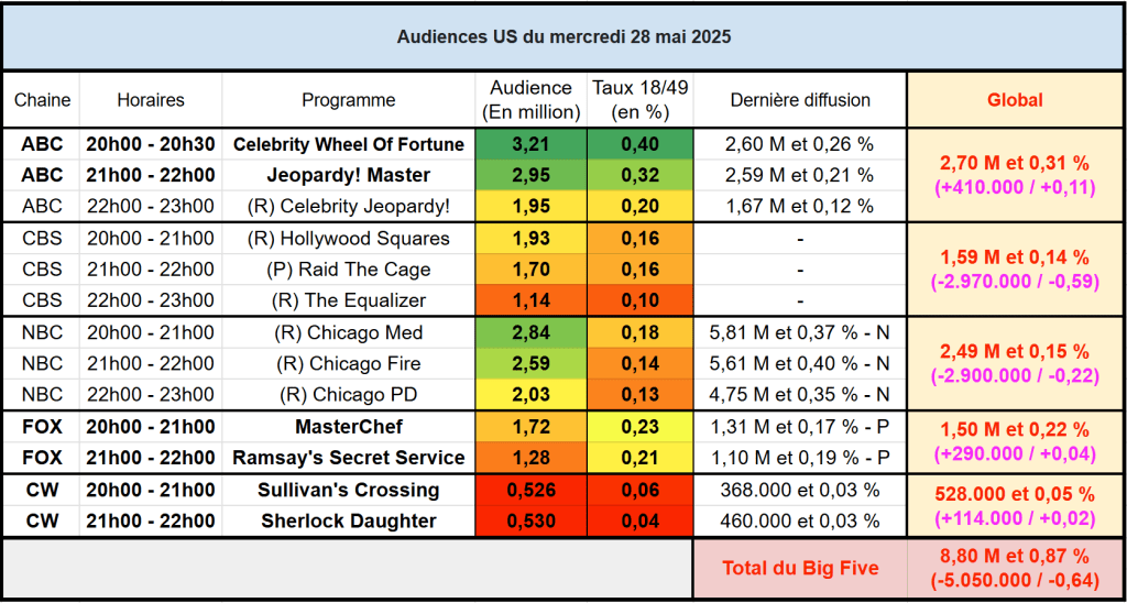 Audiences US du Mercredi 28.05.25 : Succès pour Celebrity Wheel Of Fortune qui signe son record de l’année. Record également pour Jeopardy! Master et pour les séries de CW. CBS en souffrance. MasterChef en forte hausse.