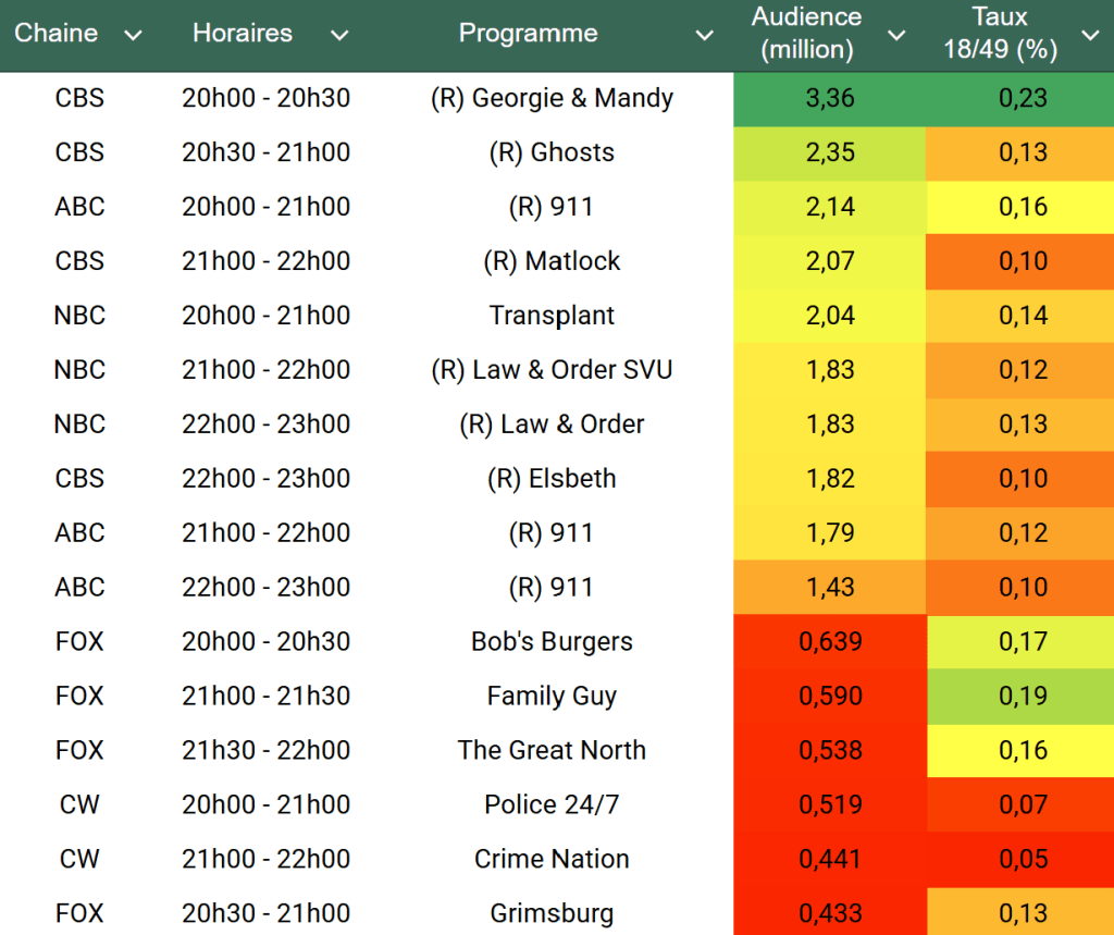 Audiences US du Jeudi 29.05.25 : Georgie & Mandy large leader sur CBS. Transplant en légère hausse. FOX très faible. Record pour les programmes de CW. Thomas Fusil Communiqués Audiences US 4 juin 2025 1 Minute Voici les audiences de la soirée du 29 Mai Audiences triées (téléspectateurs) Partager : Partager sur X(ouvre dans une nouvelle fenêtre) X Partager sur Facebook(ouvre dans une nouvelle fenêtre) Facebook J’aime chargement… Similaire Publié par Thomas Fusil Voir tous les articles par Thomas Fusil Publié 4 juin 2025